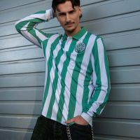 The polo-style neck, complete with two buttons and ribbed detailing, lends the shirt a formal, vintage elegance, while the long sleeves enhance its unmistakably retro appearance. On the left chest sits an embroidered patch echoing the earliest club crests, a detail that anchors the jersey firmly in its historical origins. To keep the jersey’s aesthetic as faithful as possible to the original, the embroidered Macron Hero patch, green with white outlines, is not positioned as usual on the right side of the chest, but on the right shoulder.