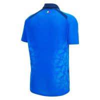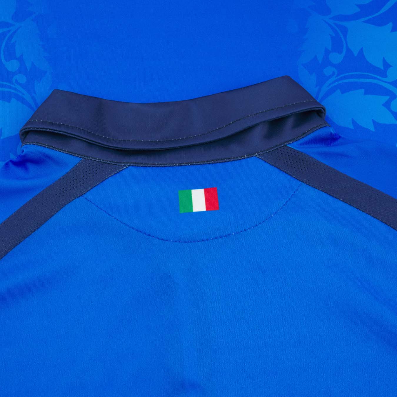 The new kit for the Italian national team consists of a blue shirt featuring a polo collar in a darker shade, echoed by the bands on the shoulders and along the sides. The collar features a three-button fastening and a tricolour detail. The inside of the collar is customised with a white and blue label bearing the F.CR.I. logo, the Macron logo and the wording Designed in Bologna, certifying that each garment is conceived, designed and developed at the Macron Campus.