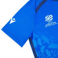 On the chest, the Federation crest patch appears on the left, with the ICC Men’s T20 World Cup logo on the right, while the word ITALY is positioned centrally below in white. The Macron Hero also appears in white on the sleeve. On the outer backneck, the Italian tricolour is printed. On both the front and back of the shirt, along the outer side, a tone-on-tone Renaissance-style floral graphic with a slightly shaded effect completes the design.