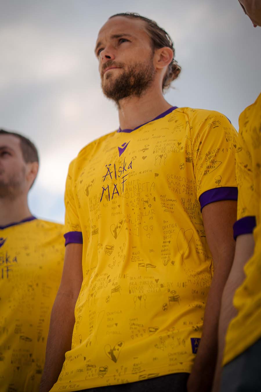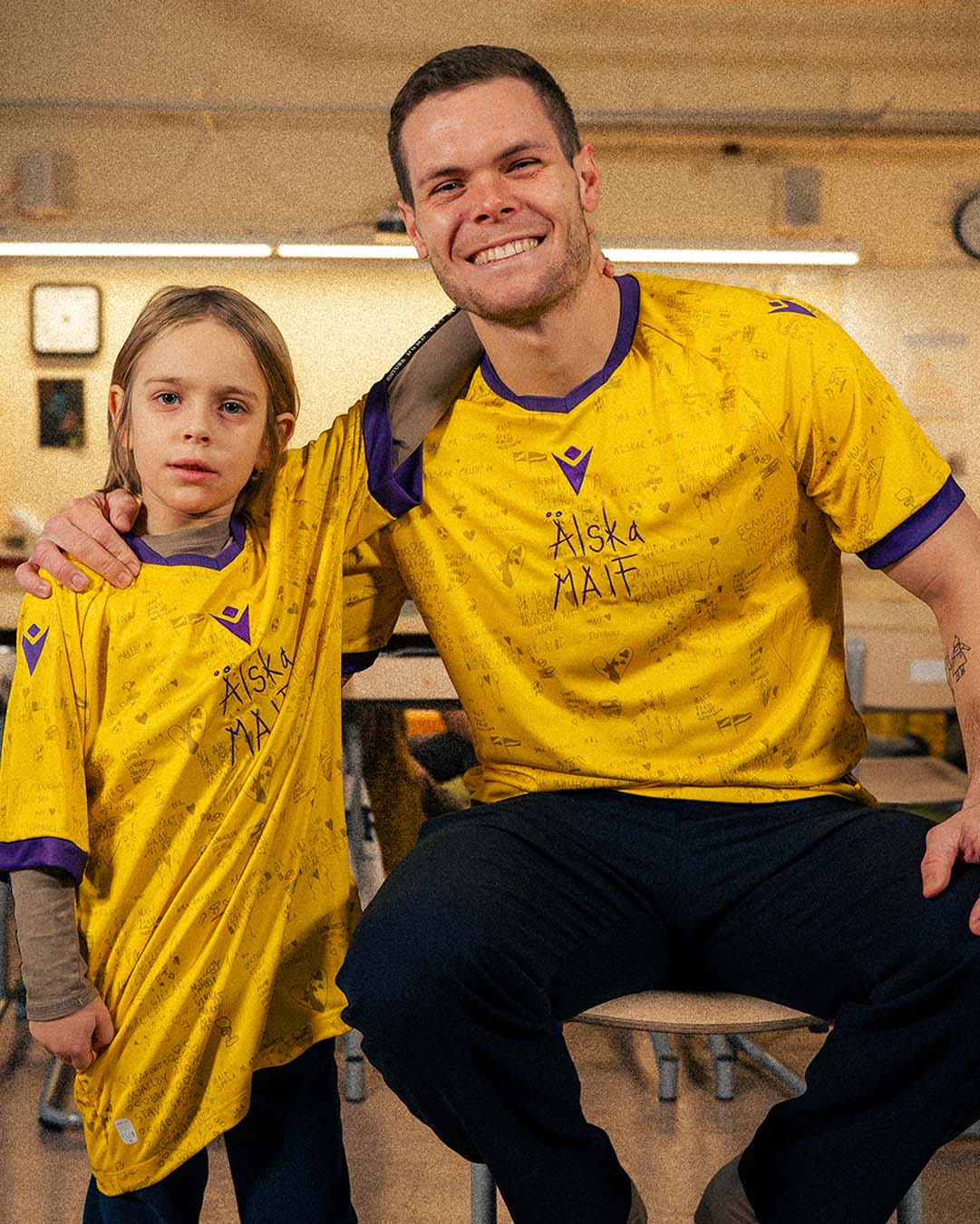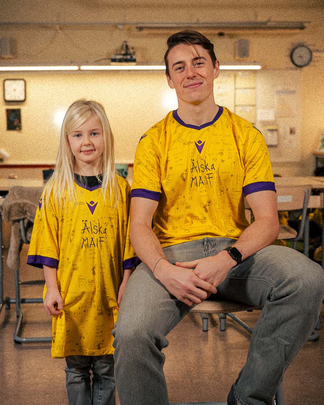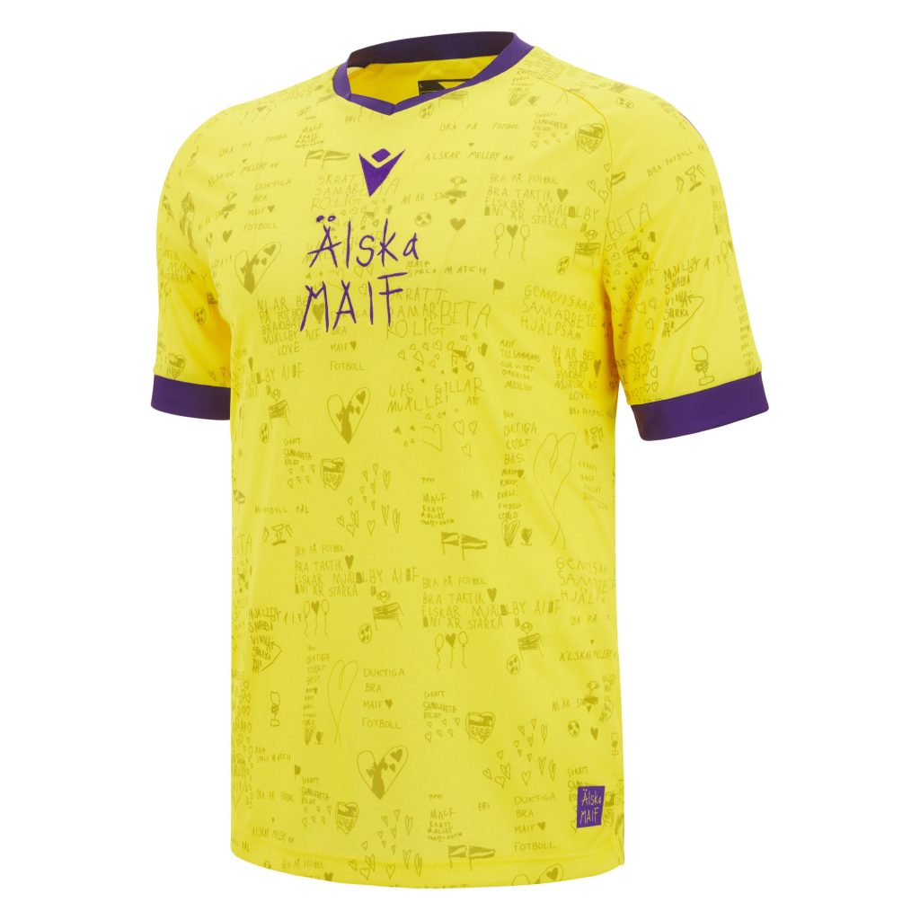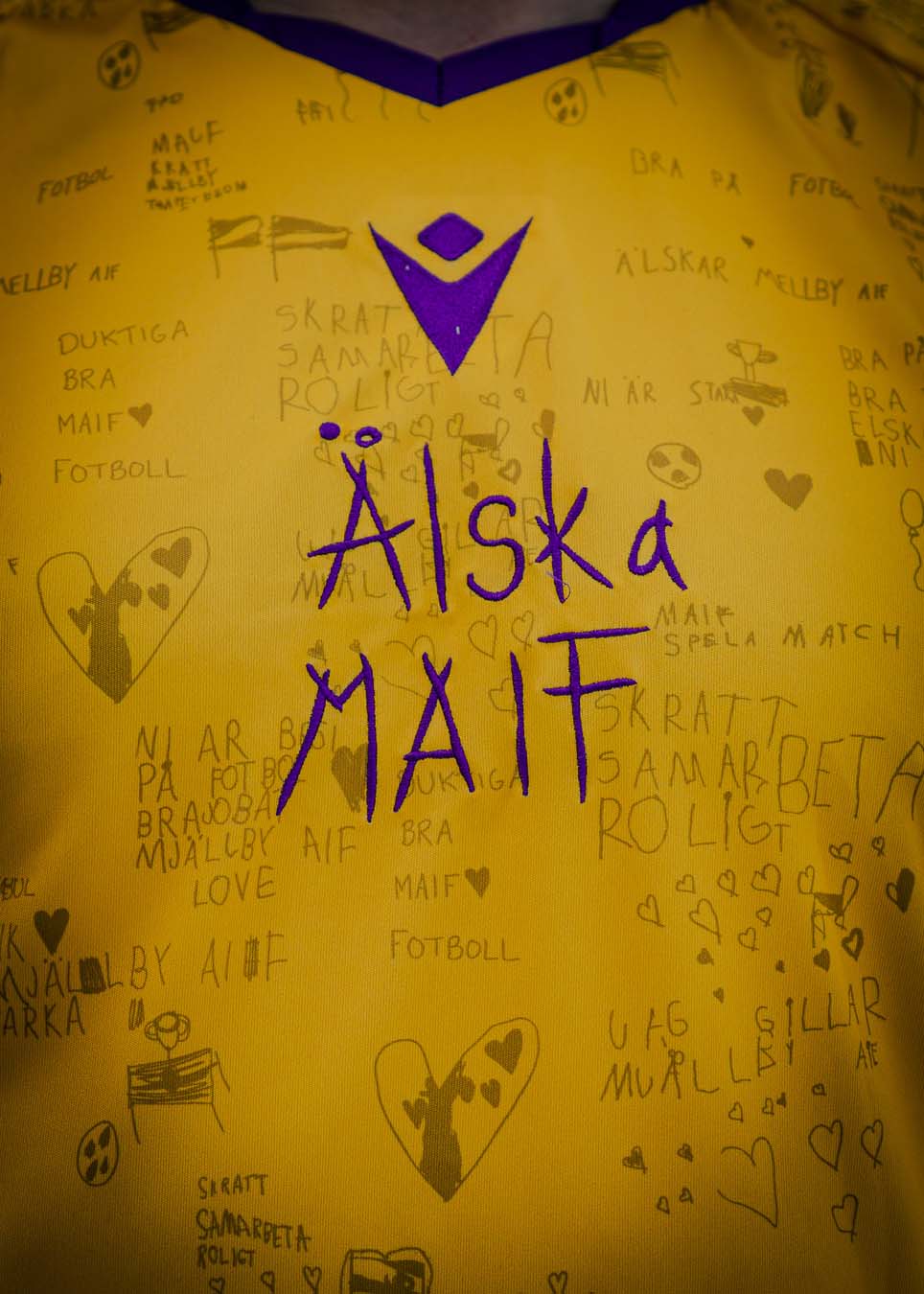The new Mjällby AIF 2026 Pre-Season shirt features a bright yellow base, the historic colour of the club, enriched by an all-over sublimated graphic composed of drawings, symbols and handwritten elements inspired by the children’s creative contributions.