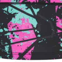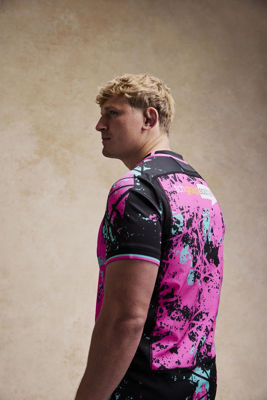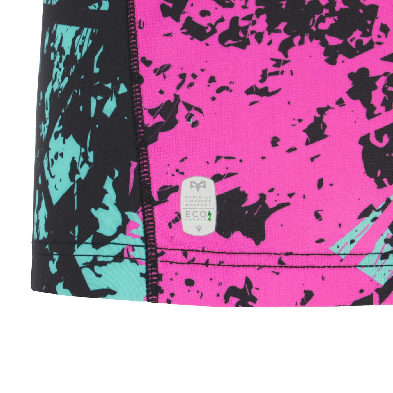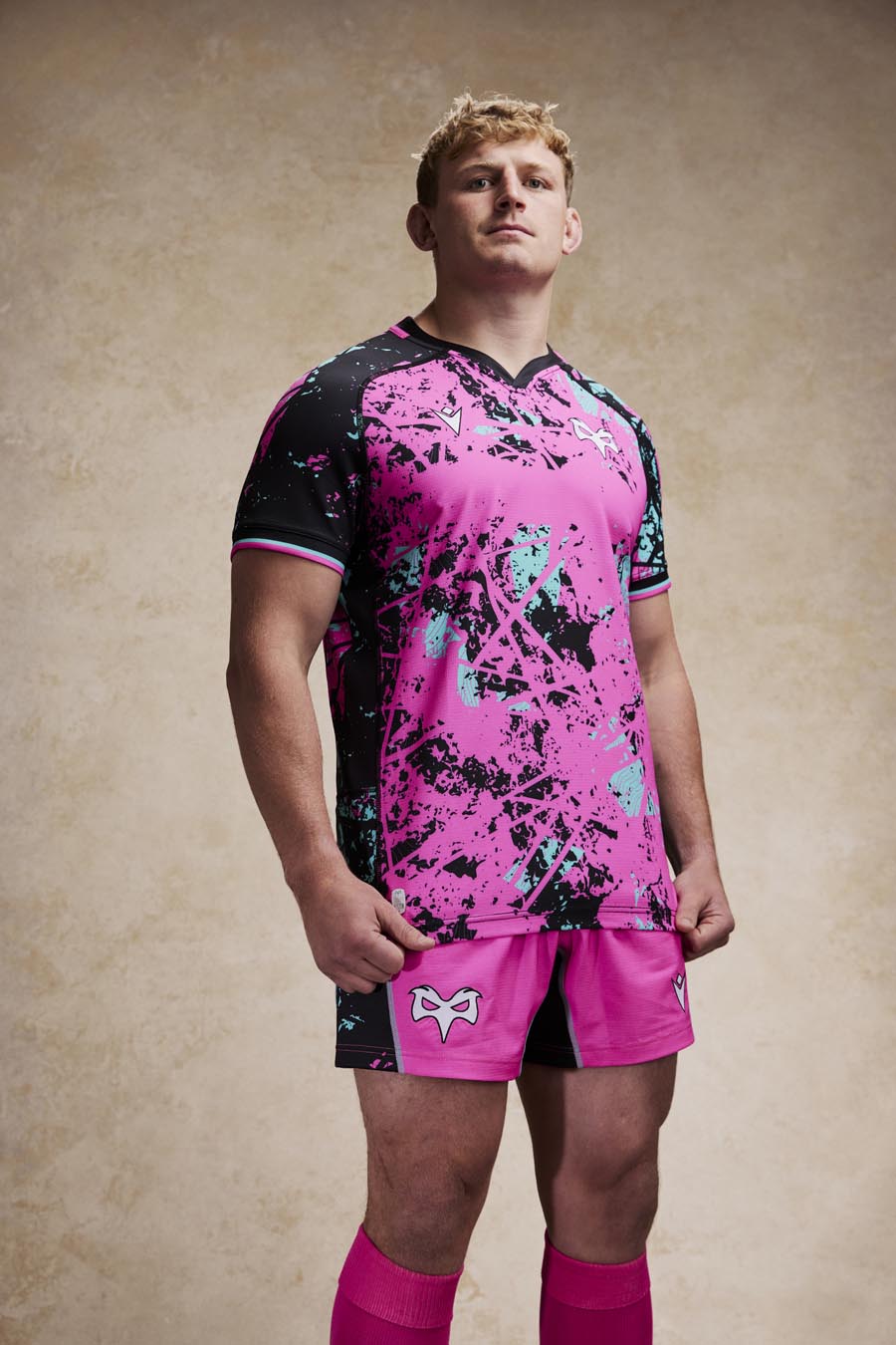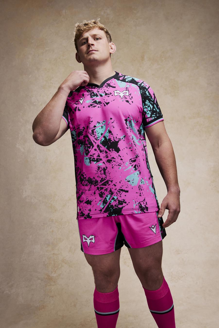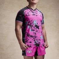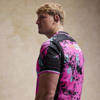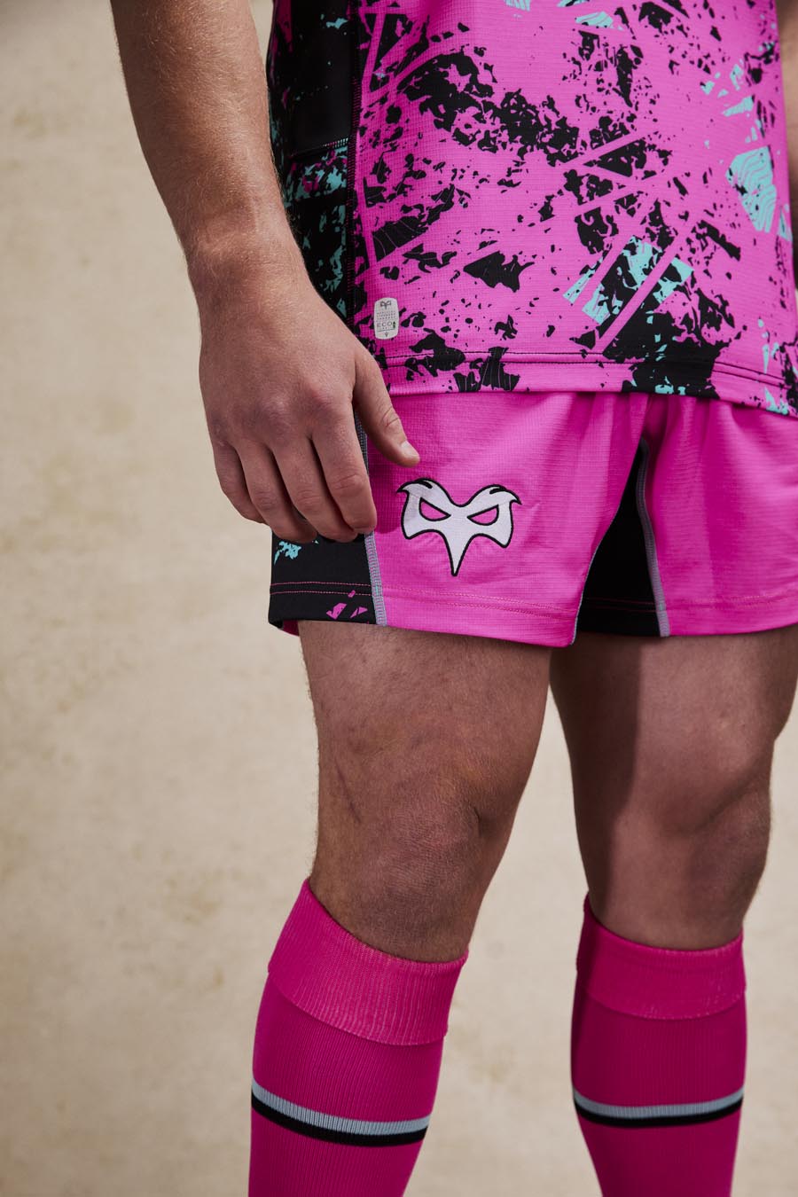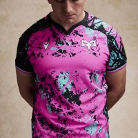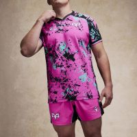 The new Ospreys Euro 2025/26 shirt has a black V-neck with pink details. The entire kit features an abstract-inspired sublimated pattern, with irregular spots and elements intersecting in three different colours: pink, black and light blue. In particular, the shoulders, sleeves and sides are predominantly black with a lower concentration of spots in the other two colours. In contrast, pink is the predominant colour in the centre of the shirt, both front and back. Finally, the sleeve edges are black and finished with two thin pink and light blue stripes. The Macron Hero logo is embroidered on the right side of the chest in white with black edging, as is the club crest on the left side. Finally, the bottom of the back of the shirt is embossed with the outline of the club’s future stadium in St. Helen’s, with the Ospreys crest inside.