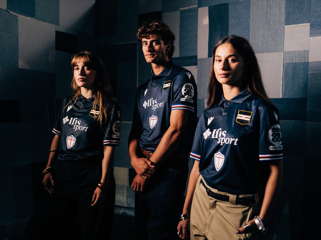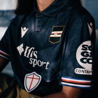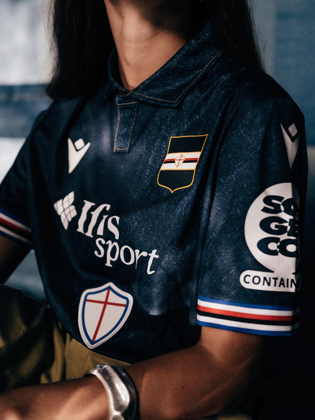 The new 2025/26 Third Shirt of U.C. Sampdoria honours the ancient history of the old port of Genova and that ‘blue fabric’ initially used for sailcloth sacks on ships and later for the practical, hard-wearing work trousers of Genoese sailors. The famous ‘Blu di Genova’ which gave rise to the English term blue jeans (from the French bleu de Gênes) and the classic denim colour. It is this story that inspires the club’s new Third Kit: a fully denim-blue shirt with polo collar, three-button fastening and gold stitching. The iconic Blucerchiati detail appears on the sleeve edges, shirt hem, shorts inserts and socks.