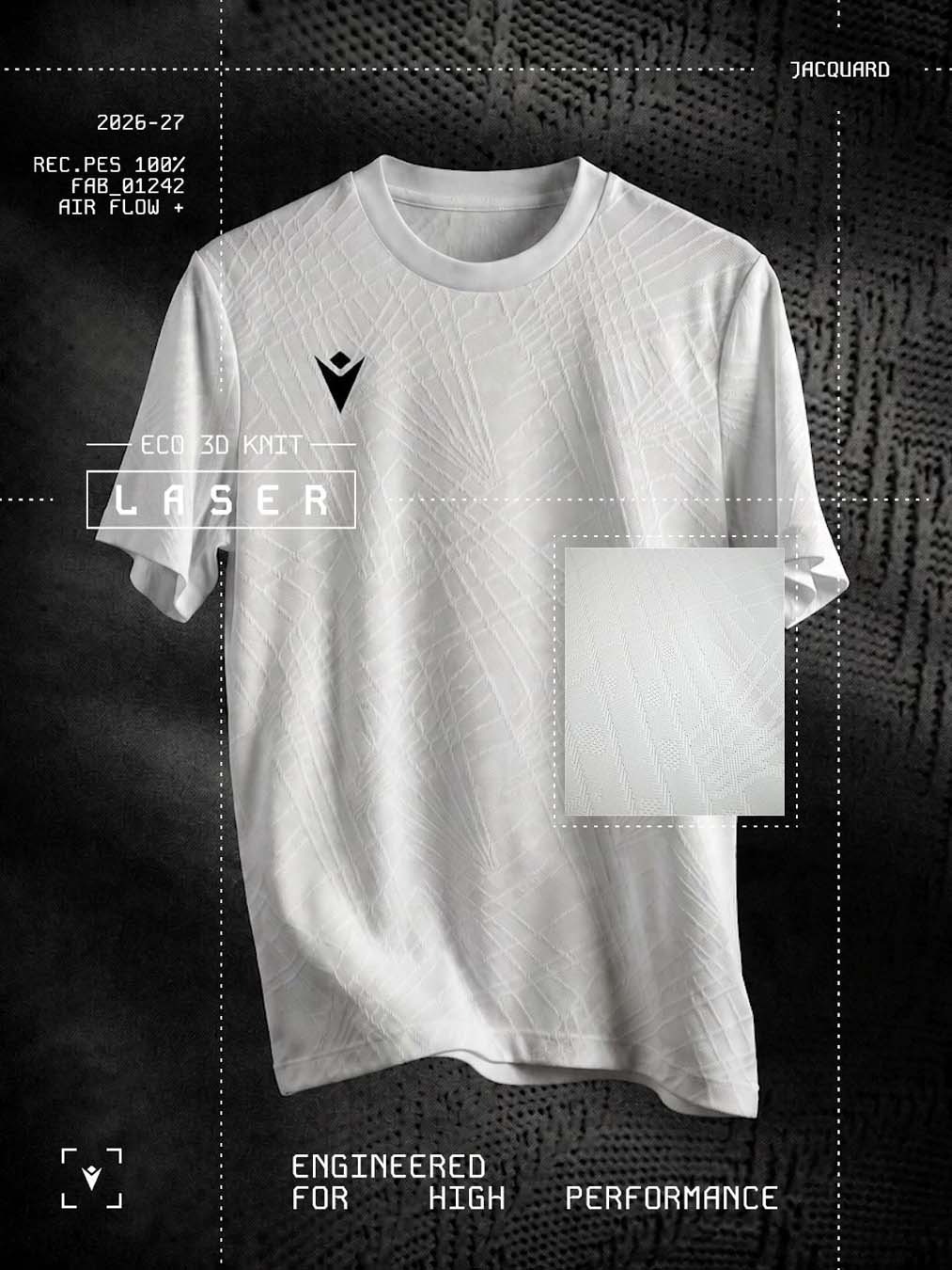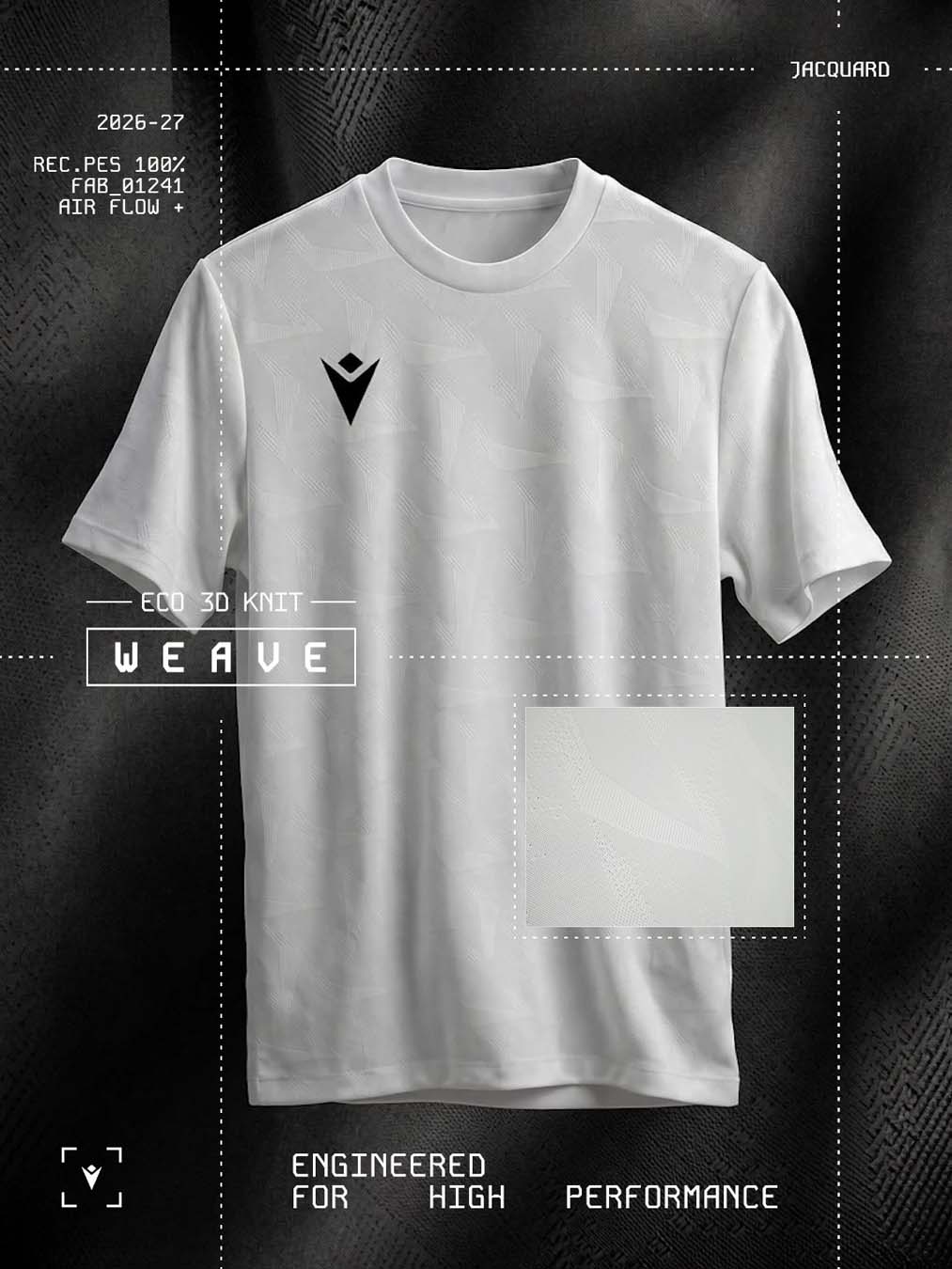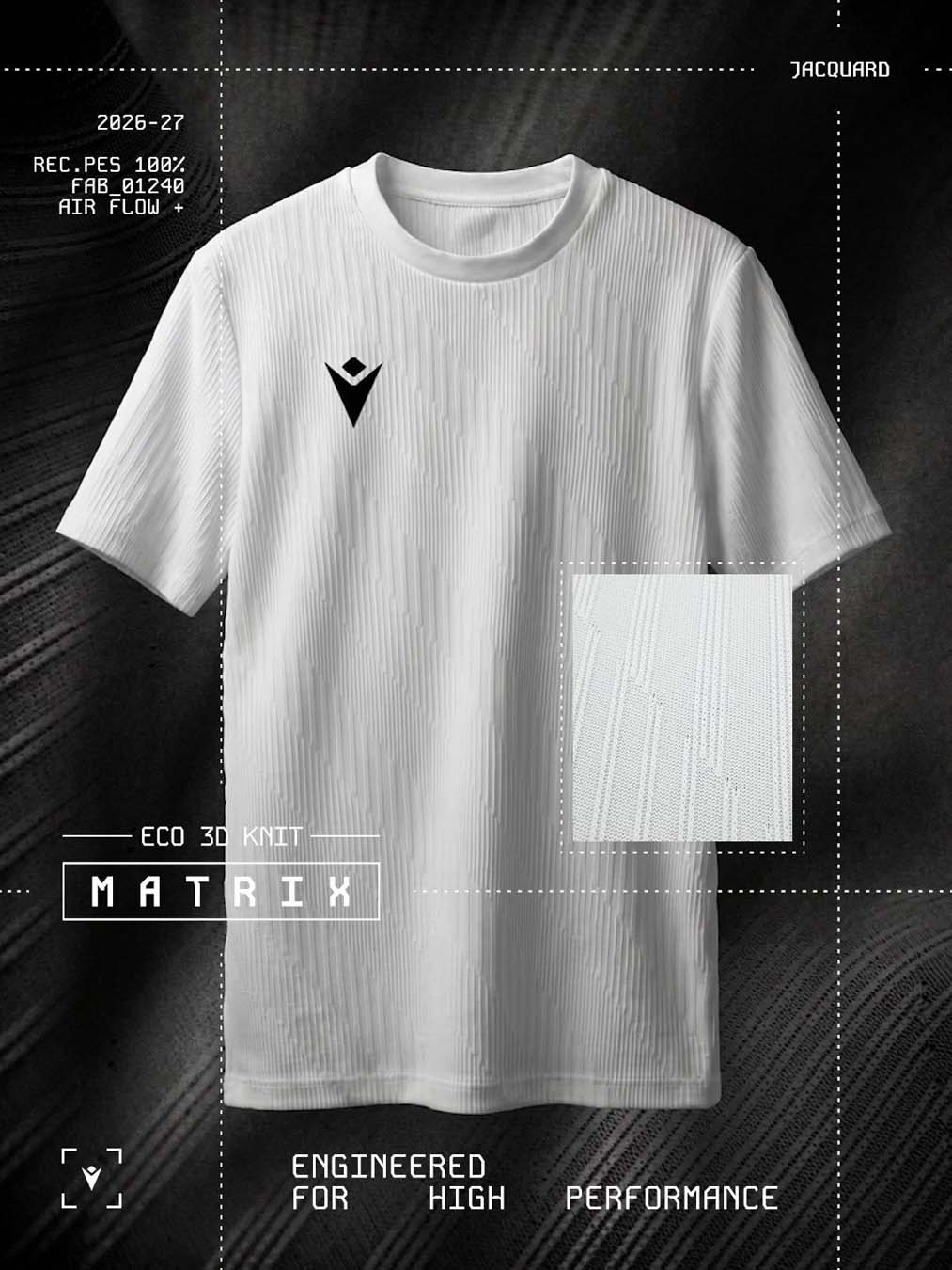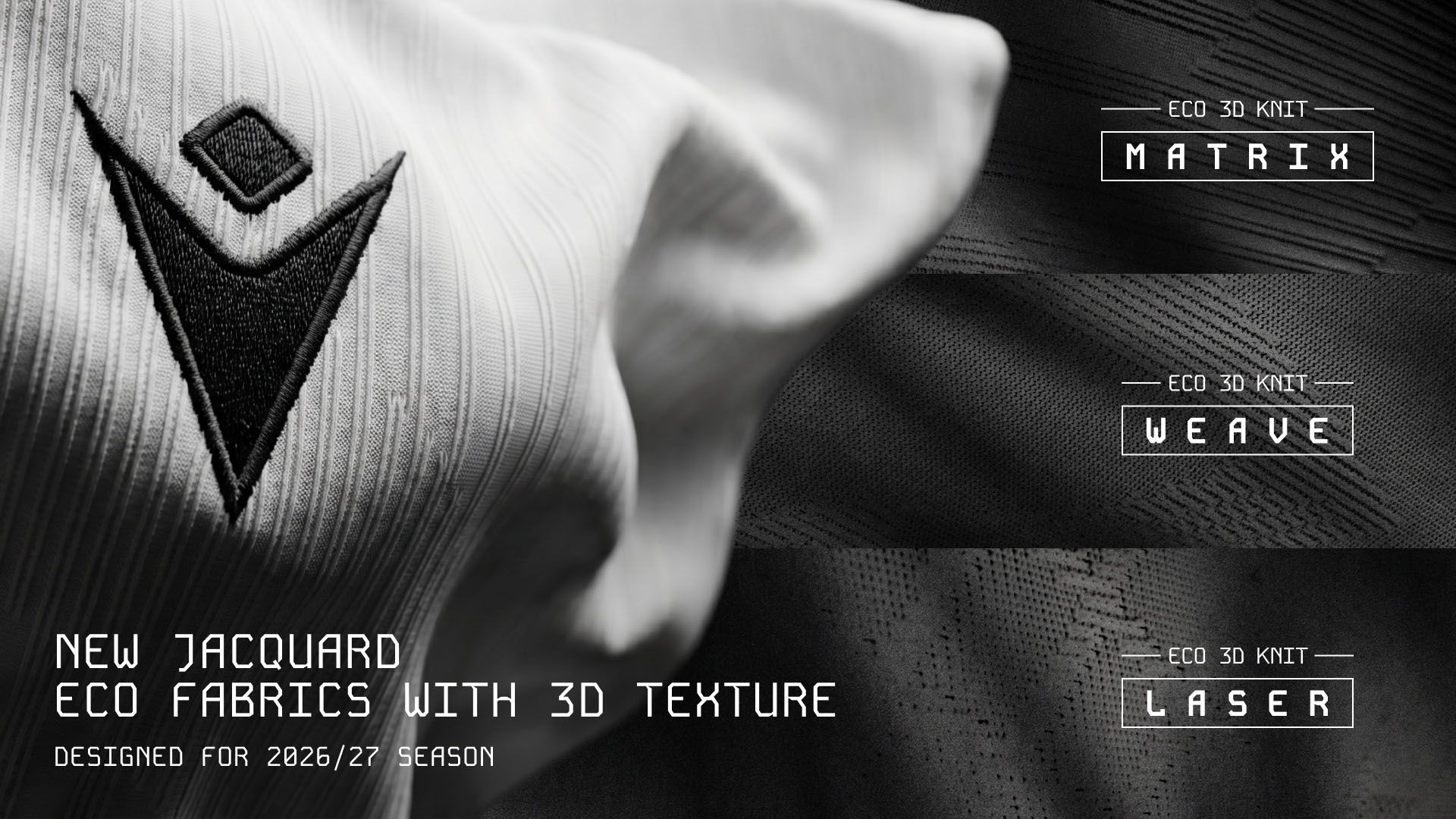 Performance tecnologica e stile innovativo: è da questo incontro che nascono i nuovi tessuti jacquard Eco 3D Knit di Macron, autentiche tele bianche ad alte prestazioni sulle quali, già nella stagione calcistica 2026/27, prenderanno forma numerosi kit gara, creati Su Misura dal Centro Stile Macron per i club partner del brand italiano.