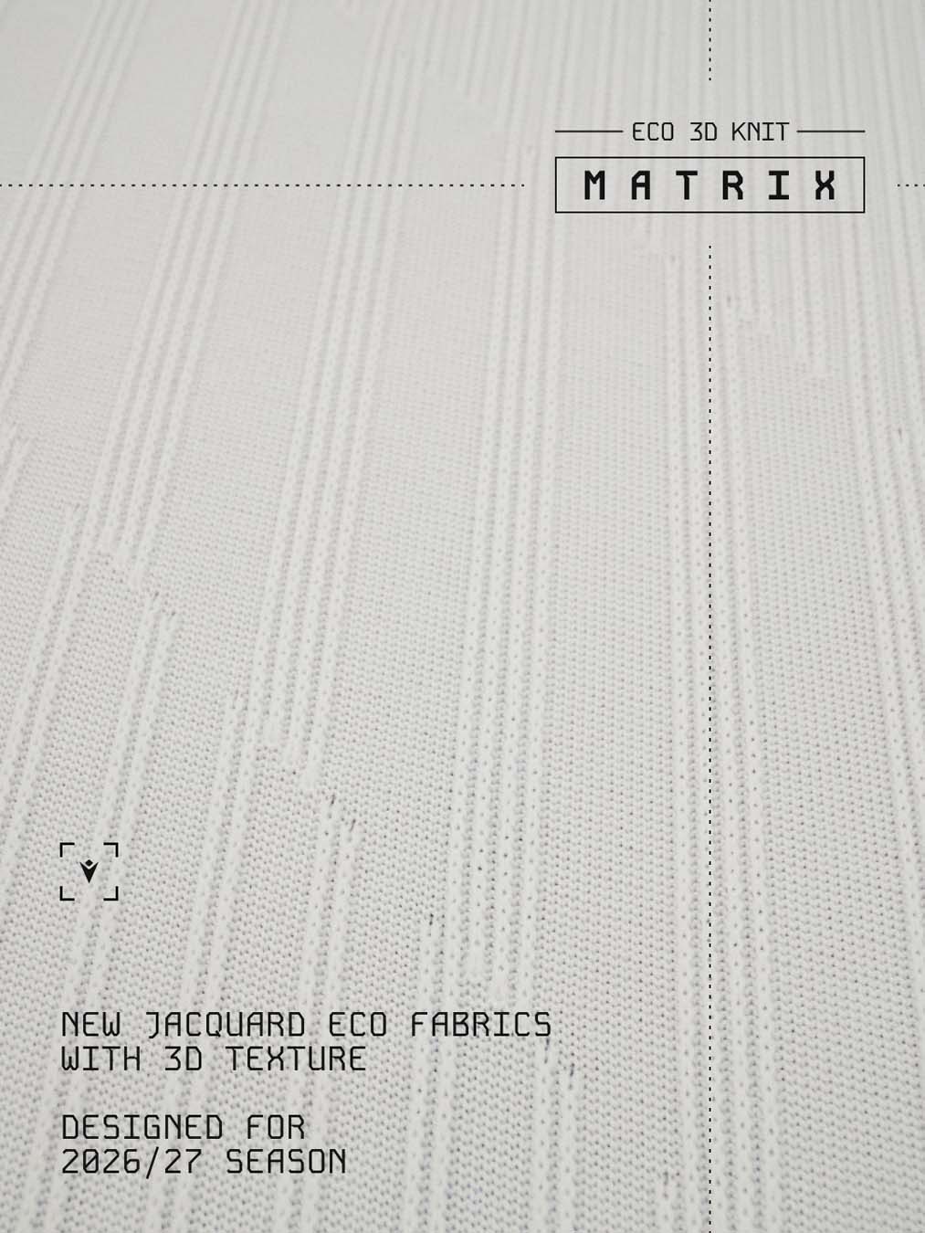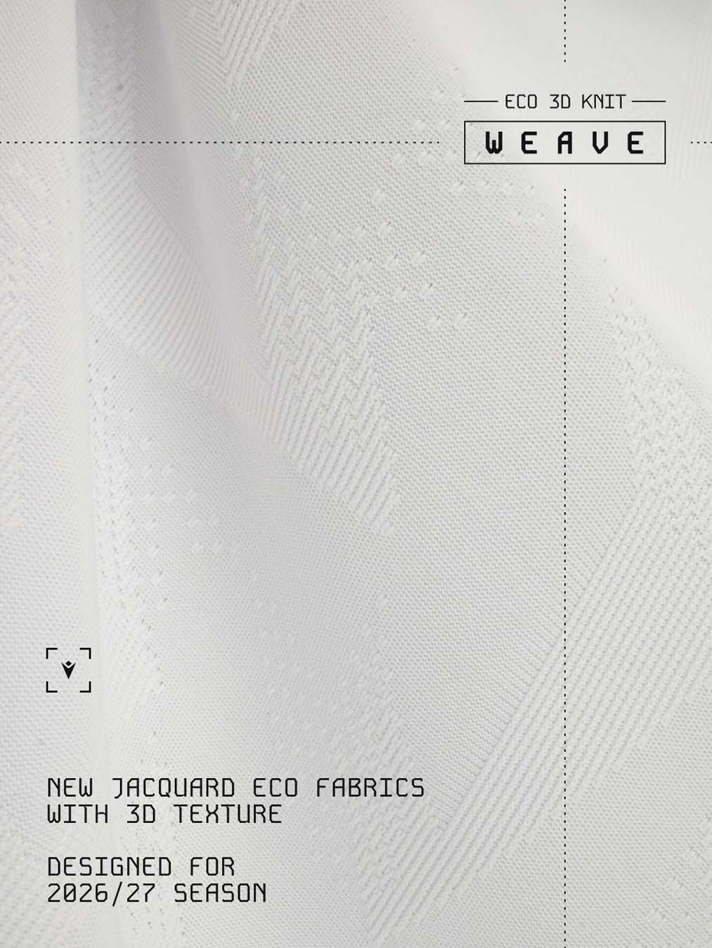 Un Jacquard tecnico ispirato alla struttura delle laser cam e progettato attraverso una combinazione di tre differenti incroci del filato. Una costruzione ibrida che consente di distribuire le performance in modo mirato: maggiore resistenza lungo le righe spezzate, elasticità nelle aree a trama piatta e zone di apertura che favoriscono la traspirabilità, piazzate in maniera irregolare. Il risultato è un tessuto ingegnerizzato pensato per capi sportivi evoluti, composto da poliestere 100% Recycled.
