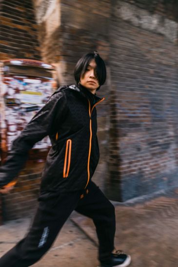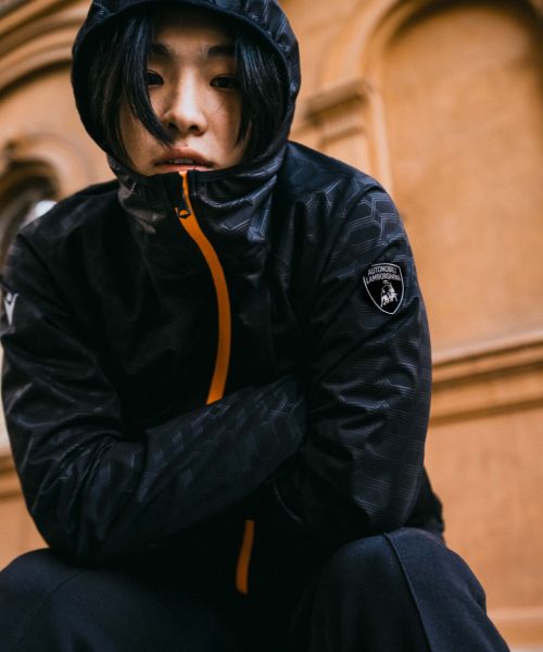 La collezione maschile comprende una rain jacket nera con dettagli in arancio Apodis, stesso abbinamento cromatico presente nella maglia a collo alto. Il verde turbine caratterizza invece la felpa con cappuccio. In tutti questi capi spicca, nella parte posteriore, poco sotto le spalle e tono su tono, la scritta Automobili Lamborghini.