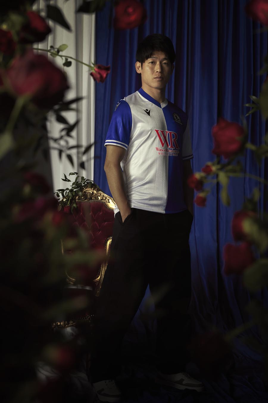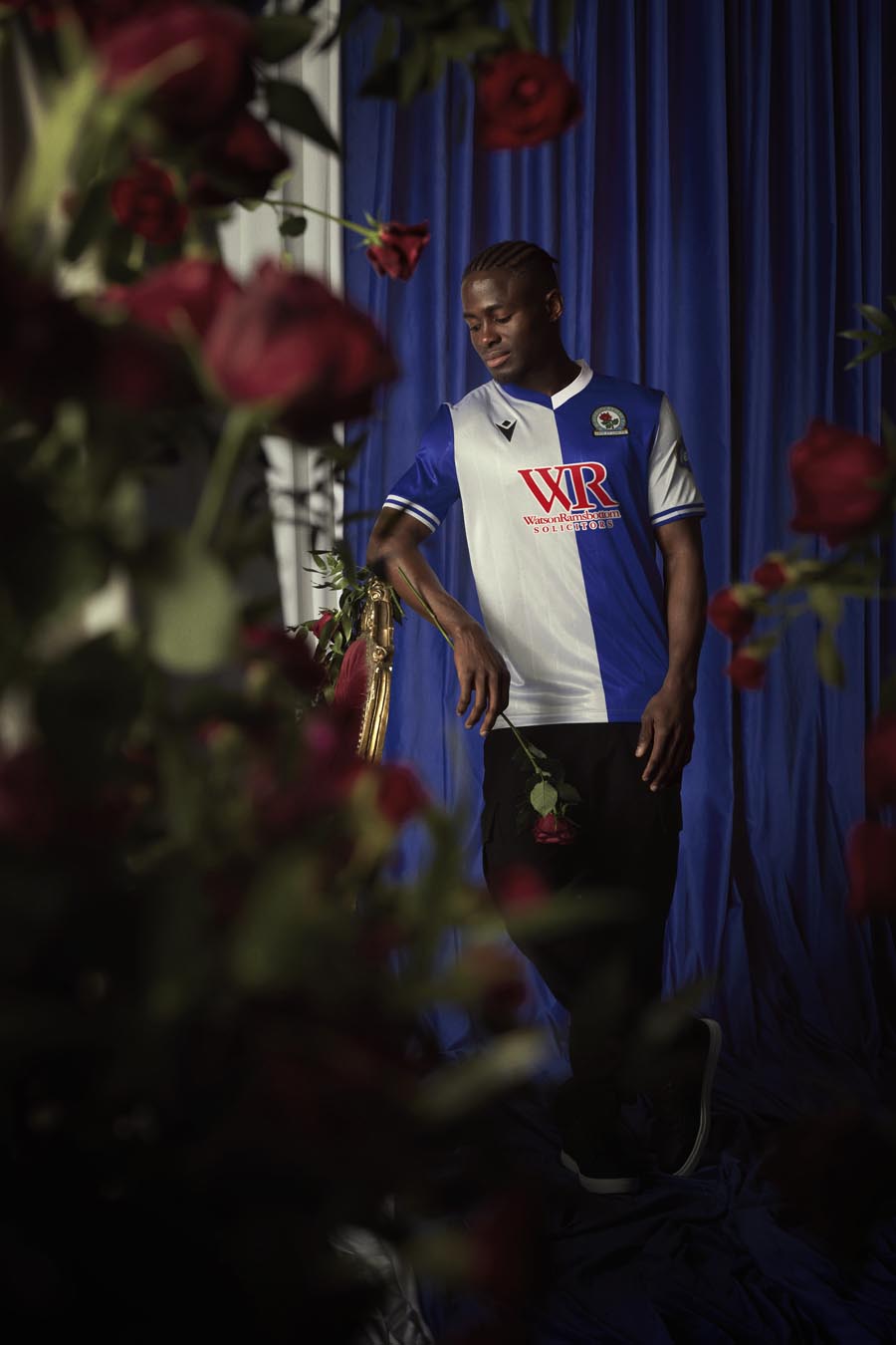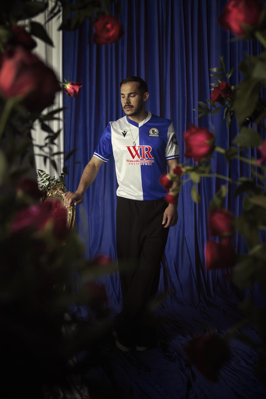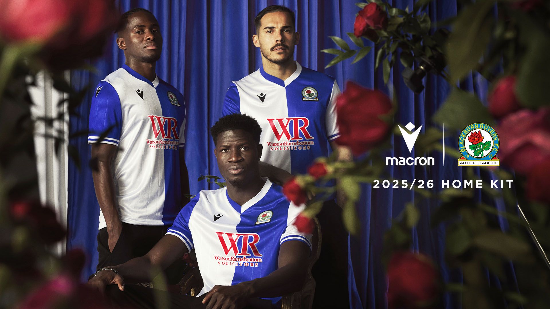 Sul petto, a destra e ricamato in nero, il Macron Hero, a sinistra, lo stemma del Blackburn Rovers FC. Un altro prezioso dettaglio è il tape personalizzato all’interno del fondo maglia anteriore dove, intervallati dal disegno della rosa, sono presenti i numeri 1875 – 150 – 2025. Nel retrocollo esterno, in nero, è applicato il particolare logo celebrativo raffigurante dei rami di rosa che ‘stringono’ al centro una moneta con al centro la cifra 150. I pantaloncini sono bianchi con dettagli blu sui fianchi e sul bordo coscia. I calzettoni blu hanno il bordo superiore bianco e al centro due righe orizzontali bianche.