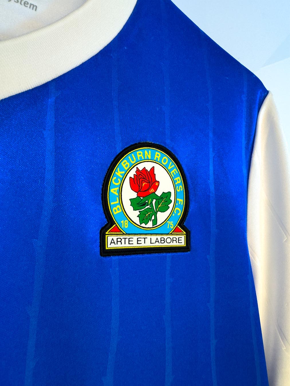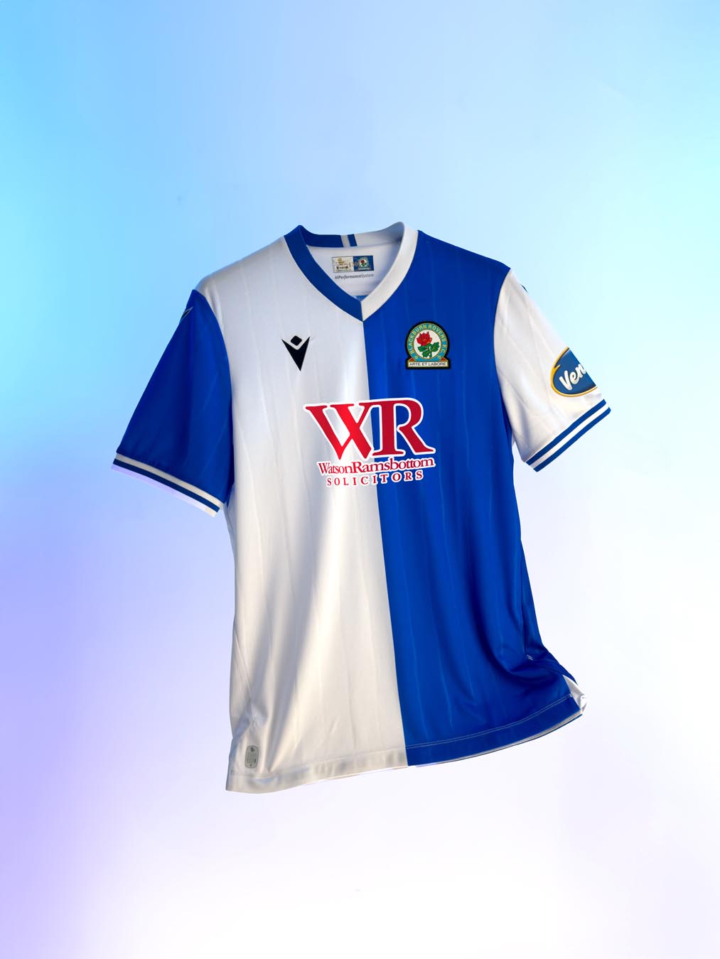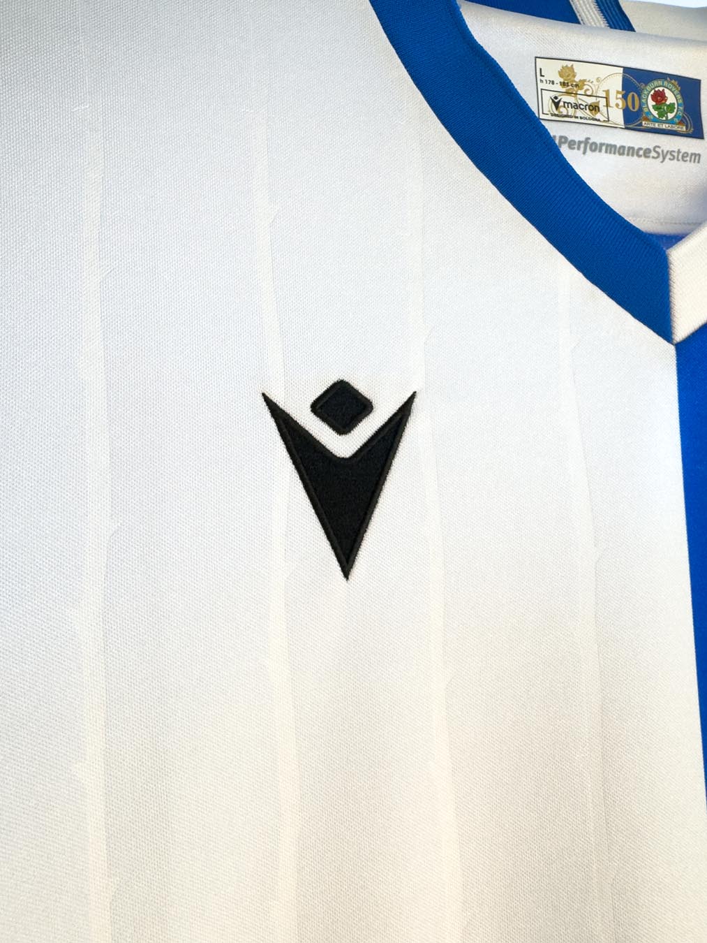 La maglia Home 2025/26 del Blackburn Rovers FC mantiene l’iconica configurazione a due metà, una bianca (destra) e una blu (sinistra), e maniche a colori invertiti. Il collo è a V con bordo bianco e blu, abbinamento cromatico che ritroviamo anche sui bordi manica. La maglia, sia fronte che retro, è caratterizzata da una grafica, embossata e tono su tono, composta da fini righe verticali che rappresentano il gambo spinato della rosa, la Lancashire rose, fiore simbolo della squadra e della contea in cui si trova la città di Blackburn. Il backneck è personalizzato con un’etichetta con sfondo che riprende i colori del club e sopra il quale appare il particolare logo dorato realizzato in occasione dei 150 anni della squadra. Nel lato sinistro dell’etichetta è invece presente il logo Macron e la scritta ‘Designed in Bologna’, a certificare ed evidenziare come ogni capo sia ideato, progettato e sviluppato nel Macron Campus, Headquarters del brand italiano.