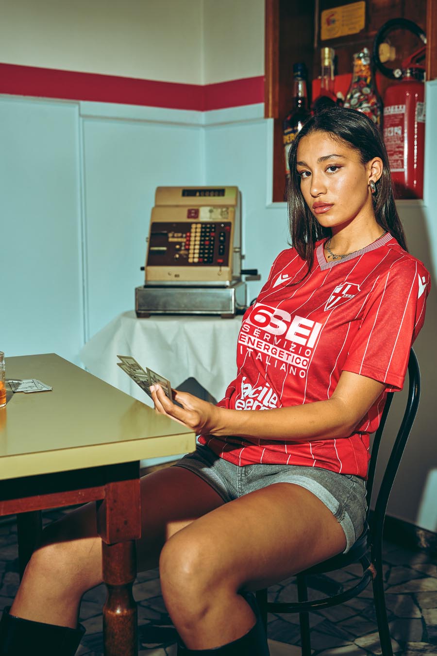 La versione Away 2025/26 è anch’essa con collo a V bianco, caratterizzato in questa caso da fini righe rosse. Il design del kit è a bande verticali in due tonalità di rosso, separate da sottili strisce bianche che creano un effetto gessato. All’interno delle bande in rosso più scuro è presente una grafica, tono su tono, ad effetto punteggiato. Il Macron Hero sul petto è bianco ed è affiancato, a sinistra, dallo stemma dell’Associazione Calcio Padova. I pantaloncini sono rossi con coulisse bianche, i calzettoni riprendono, in orizzontale, la grafica della maglia a bande con tonalità differenti di rosso e hanno il bordo superiore bianco con fini righe orizzontali, sempre rosse.