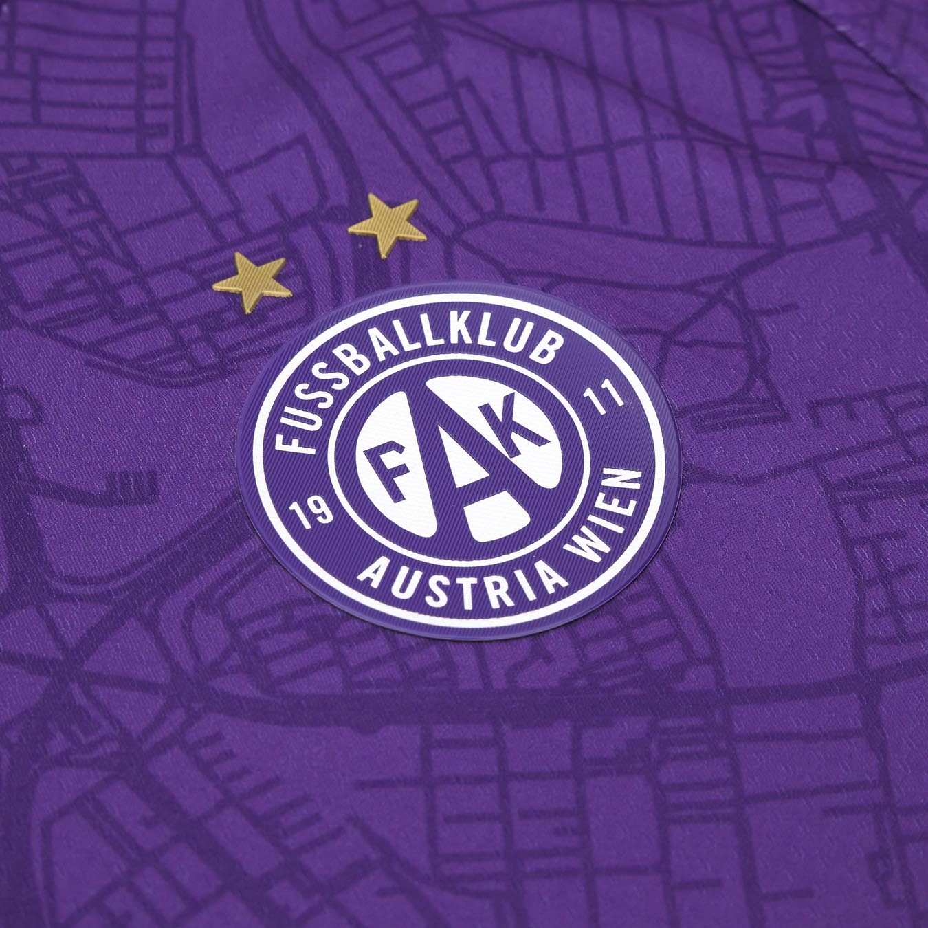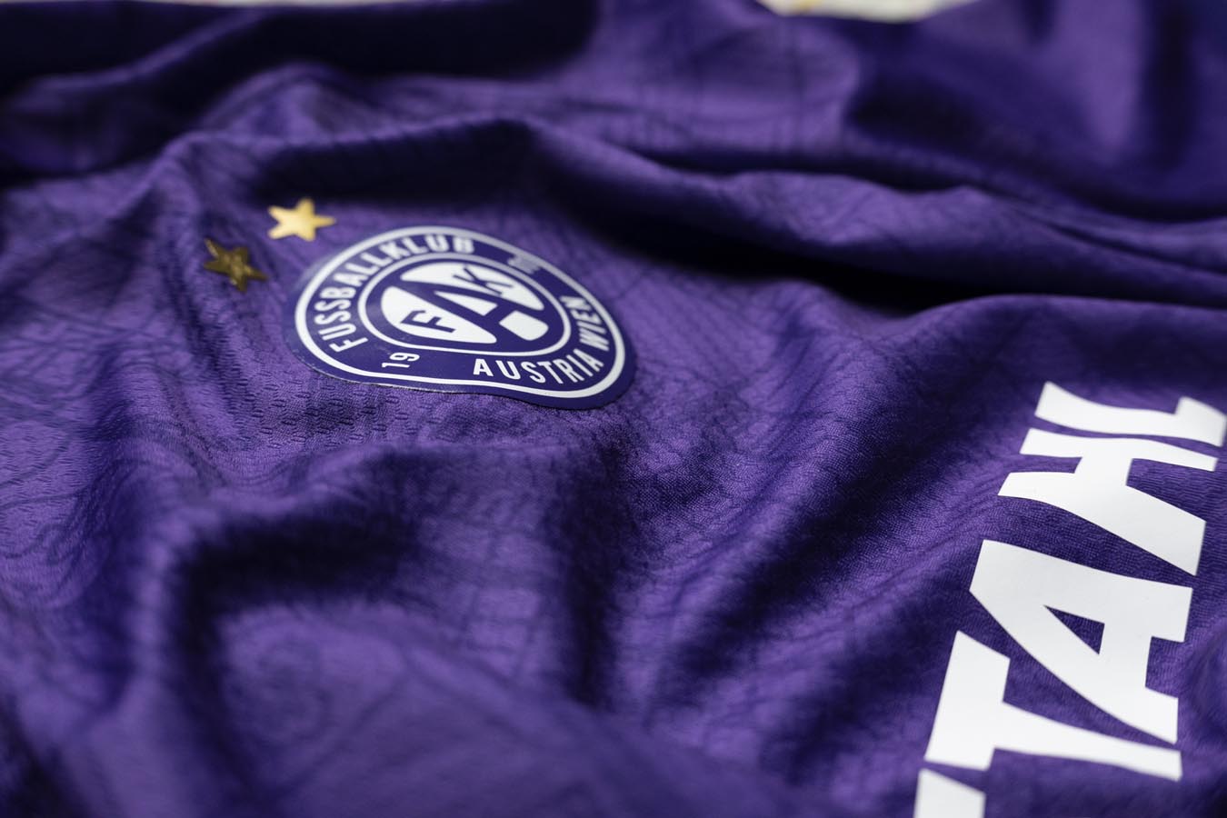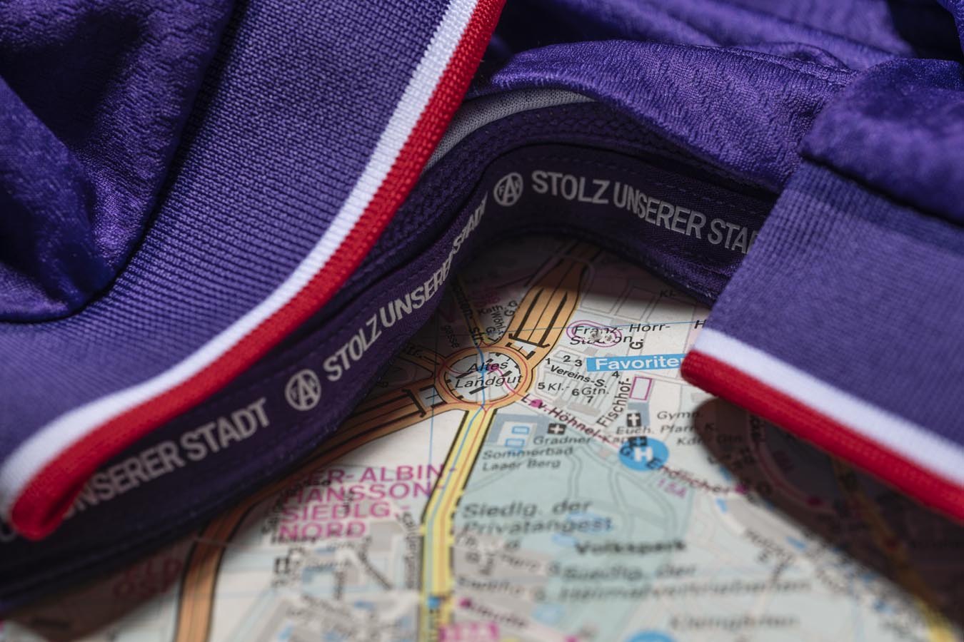 Il nuovo Home Kit dell’FK Austria Wien è espressione di identità, senso di appartenenza, uniti alla qualità sartoriale, creatività e design che sono i segni distintivi di Macron, dallo scorso anno partner tecnico del club austriaco e un brand leader nel mondo dello sportswear. La tradizione del colore viola che contraddistingue da sempre l’Austria Wien è arricchita, fronte e retro, da una grafica sublimata, sfumata e tono su tono che rappresenta la mappa della storica capitale austriaca. Con Favoriten (10°) sul petto, Simmering (11°) sulle maniche e Floridsdorf (21°) e Donaustadt (22°) sul retro, sono stati in questo modo immortalati i quattro distretti con il maggior numero di membri su una maglia.