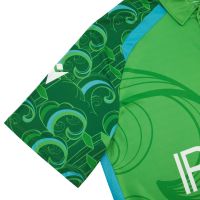 Il colore predominante del kit è il verde, in continuità con i design più recenti della Nazionale irlandese. Le maniche e le spalle presentano una tonalità più scura, mentre un verde più chiaro caratterizza il colletto a tre bottoni, sia nella parte anteriore che posteriore della maglia. Lungo i fianchi e attorno alle spalle corrono bande verticali azzurro chiaro.
