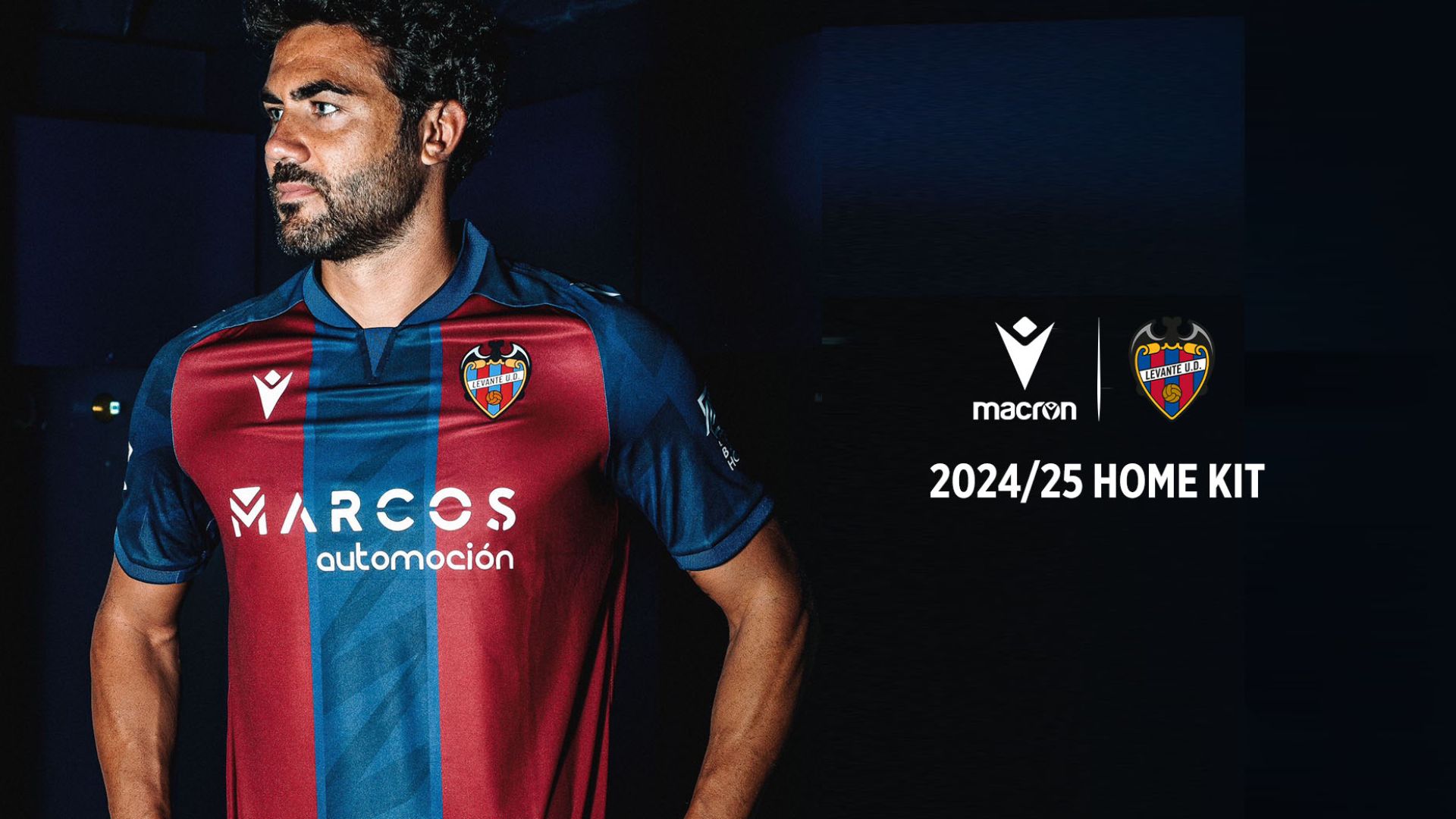 La nuova maglia Home 2024/25 del Levante UD per la stagione 2024-25 è azulgrana come da tradizione, con la fusione dei due colori blu navy e granata. In particolare, il corpo della maglia è composto da tre ampie bande: due laterali color granata e una centrale blu navy, colore che caratterizza anche spalle e maniche. In tutte le parti blu navy è inoltre presente una grafica in stampa sublimata tono su tono composta da elementi diagonali e irregolari che si sovrappongono creando differenze di tonalità. Il backneck è personalizzato con i colori del Levante UD, il logo del club, il logo Macron e la scritta Designed in Bologna, a certificare ed evidenziare come ogni capo sia ideato, progettato e sviluppato presso il Macron Campus.