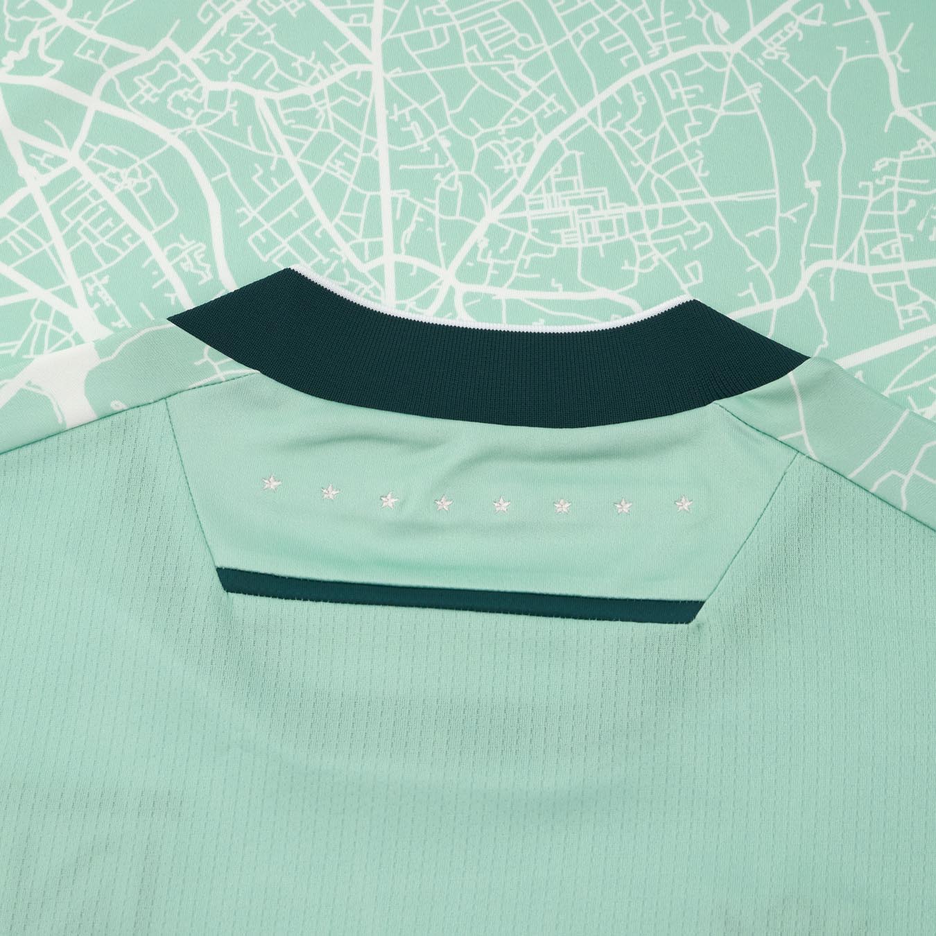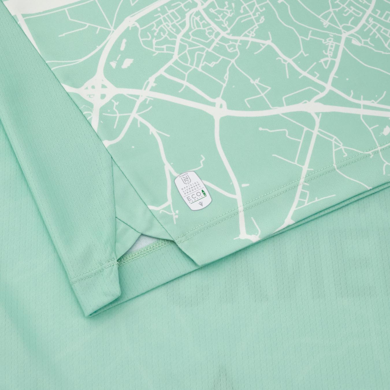 La nuova maglia da trasferta dell’FC Nantes è un grande omaggio allo stretto legame tra la squadra bretone e la sua città. La maglia, di colorazione verde acqua, è infatti contraddistinta nella sua parte anteriore da una grafica, in stampa sublimata, con il disegno della cartina di Nantes. Il collo è alla coreana con bordo in maglieria verde bottiglia e riga color panna, abbinamento cromatico che ritroviamo anche sui polsi delle maniche.