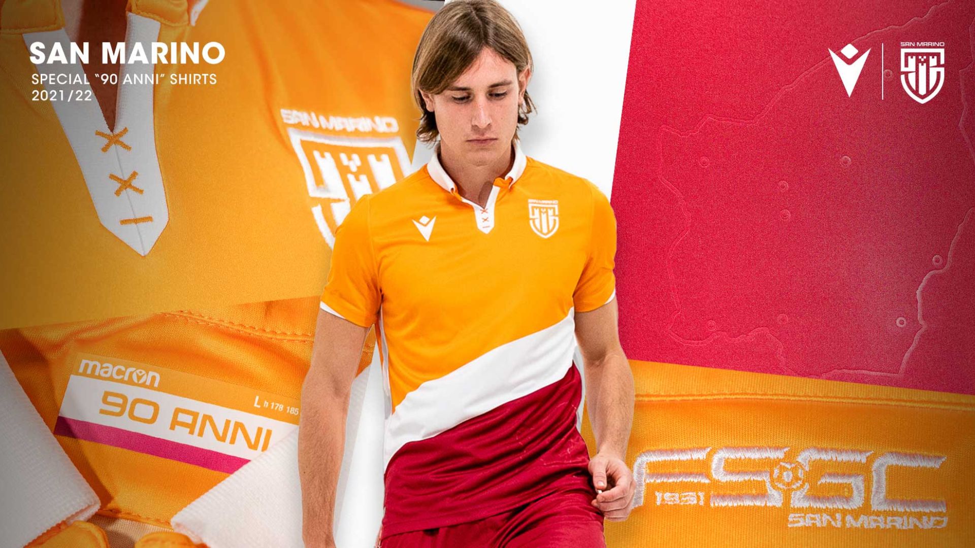 La Nazionale di San Marino scende in campo, questa sera, in uno storico confronto contro l’Inghilterra, valido per le qualificazioni ai prossimi Mondiali di calcio. Storico non solo per il palcoscenico e la portata dell’avversario, ma anche per la speciale maglia ‘limited edition’, realizzata da Macron, celebrativa dei 90 anni di storia della Federazione Sanmarinese Gioco Calcio. Una maglia unica a partire dai colori utilizzati, ripresi dalla prima storica bandiera di San Marino (dal 1465 al 1797), fino ai dettagli grafici che fanno riferimento all’identità nazionale.