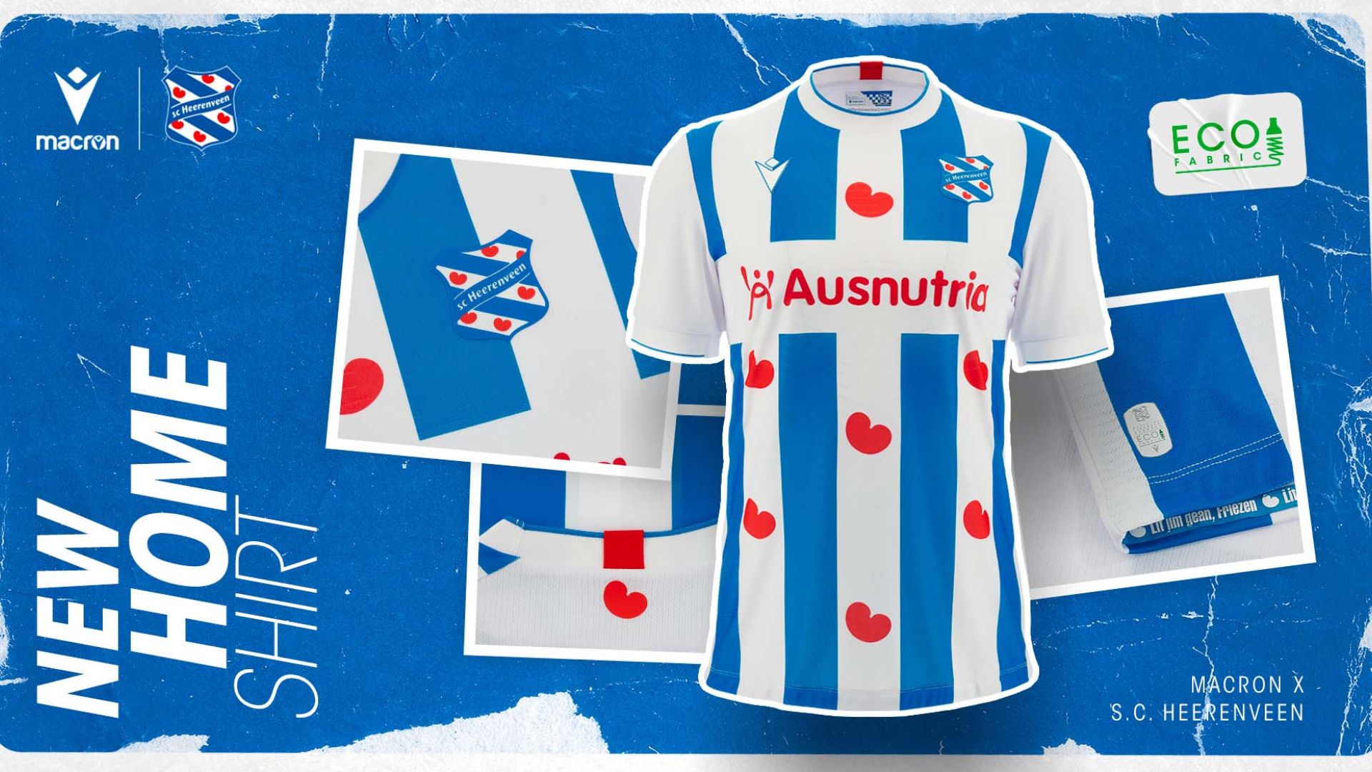 La nuova ‘Home’ dell’SC Heerenveen, a girocollo, presenta le tradizionali bande verticali bianche e blu. Nelle parti bianche sono inseriti, in grafica sublimatica, i petali rossi di pompeblêd, nome frisone che indica le foglie della ninfea gialla, presenti nella bandiera della Frisia e nello stemma del club. Il backneck è personalizzato con il logo e i colori del club insieme al logo Macron e alla scritta Designed in Bologna’, a certificare ed evidenziare come ogni capo sia ideato, progettato e sviluppato nell’Headquarters del brand italiano.