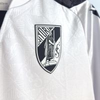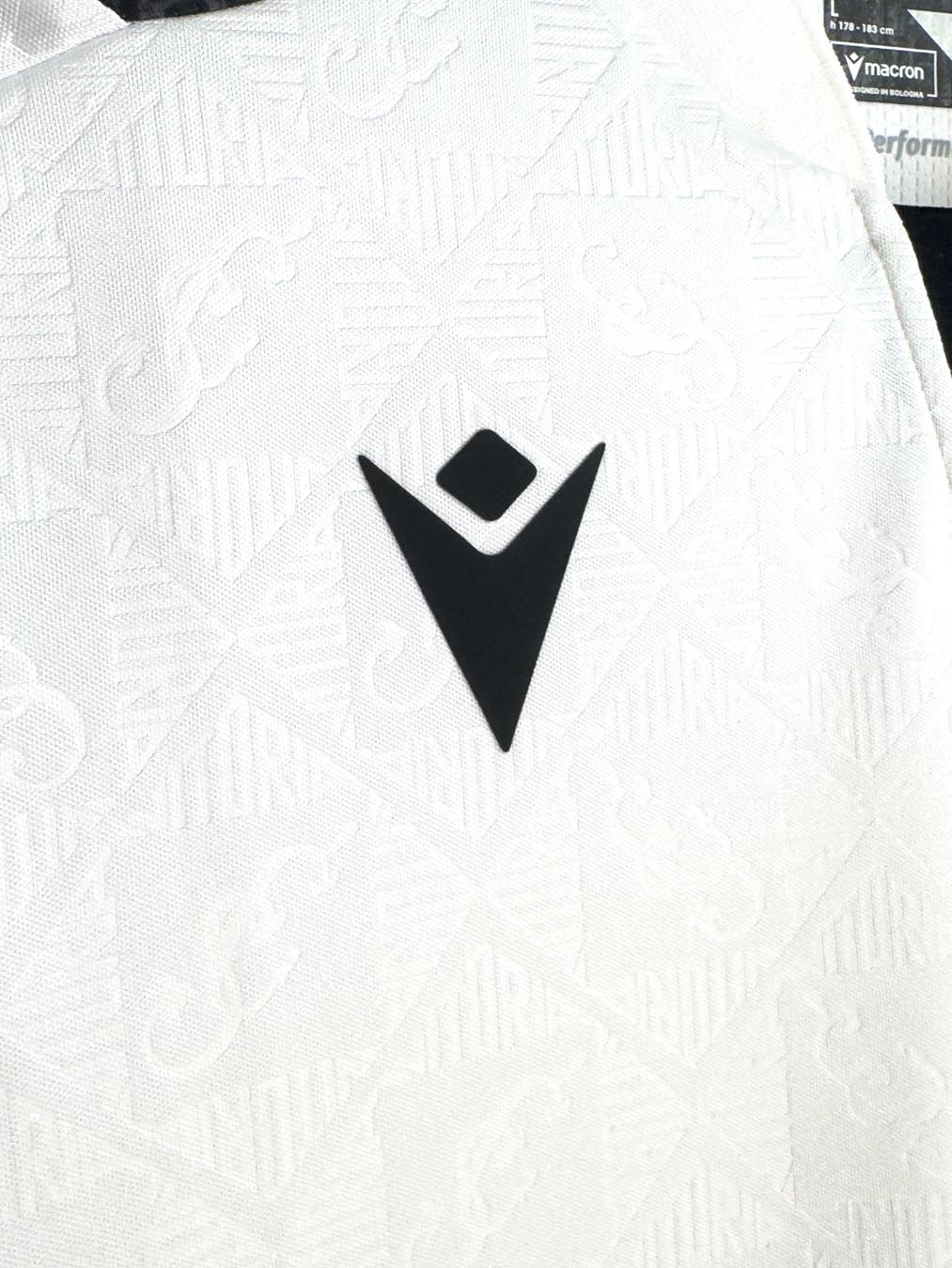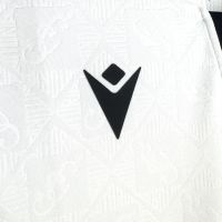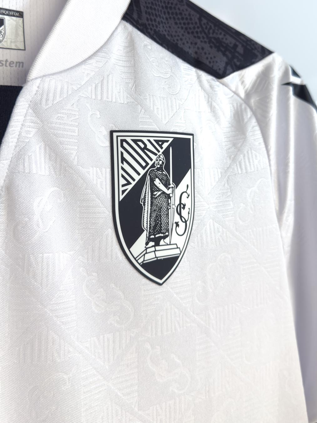 La nuova Home 2025/26 del Vitoria SC è bianca ed è caratterizzata da un pattern grafico embossato presente su tutta la maglia, che è realizzato utilizzando elementi del logo del club, ovvero la scritta su base triangolare ’Vitoria’, posta sui quattro angoli a formare un rombo, insieme alla sigla SC (Sport Clube). Negli inserti neri sulle spalle e sul fondo maglia è presente un pattern sublimato inspirato dalla figura del Re Alfonso Henriques, raffigurato al centro del logo del club. Il backneck è personalizzato con etichetta con i colori e lo stemma del Vitoria SC, il motto “A VITÓRIA, A CONQUISTA!“, il Macron Hero e la scritta ‘Designed in Bologna’ che certifica come ogni capo sia ideato, progettato e sviluppato nel Macron Campus. Sul petto in stampa siliconata e in nero, il Macron Hero, a sinistra lo stemma del club. Nel retrocollo esterno è stampato l’acronimo VSC (Vitoria Sport Clube). I pantaloncini bianchi hanno bande laterali nere all’interno delle quali troviamo il motivo grafico presente sulle spalle. I calzettoni bianchi hanno il bordo superiore nero. Grazie al pattern embossato e all’utilizzo di tessuto Eco Everton che crea un effetto lucente, l’intero kit intero richiama alla cotta di maglia, l’armatura a veste, indossata da Re Alfonso Henriques nell’immagine presente nel logo del club.