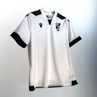 Il nero è il colore dominante della versione Away, con collo a V in maglieria e bordi manica a righe bianconere. La maglia è caratterizzata da un pattern grafico astratto, molto moderno, con linee ed elementi diagonali inspirati sempre all’inclinazione degli elementi presenti nel logo del club. Il backneck è identico a quello presente nella Home e il Macron Hero sul petto, a destra, è in stampa siliconata bianca ed è affiancato dallo stemma del Vitoria SC. L’anagramma VSC anche in questo caso appare, in bianco, nel retrocollo esterno. Il kit da trasferta è completato da pantaloncini neri con inserti sui fianchi che riprendono la grafica della maglia. I calzettoni neri hanno due bande orizzontali bianche poco sotto il bordo superiore. Il principale tessuto utilizzato in questo secondo kit è Eco Knit Effect che utilizza la tecnologia jacquard per intervenire direttamente sulla trama del tessuto e creare effetti tridimensionali.