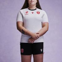 La versione Away WRWC, sempre a girocollo con dettagli rossi e neri, è in off-white, ed è caratterizzata da una grafica sublimata e all-over che rappresenta la mappa topografica del ‘Yr Wyddfa’, ovvero l’iconico massiccio montuoso presente nel Galles settentrionale. La stessa grafica è presente nelle bande nere verticali sul fianco della maglia. Il backneck è identico a quello della maglia Home. Sul petto, in rosso, a destra il logo ufficiale della Women’s Rugby World Cup 2025, al centro, ricamato, il Macron Hero, a sinistra lo stemma della Welsh Rugby Union. Nel fondo maglia posteriore, in rilievo, la scritta CYMRU. I pantaloncini neri hanno bande in off-white sui fianchi e con all’interno la grafica della maglia. I calzettoni neri hanno il bordo superiore bianco con sottile linea rossa.