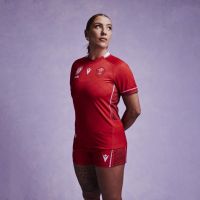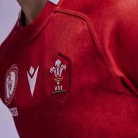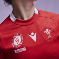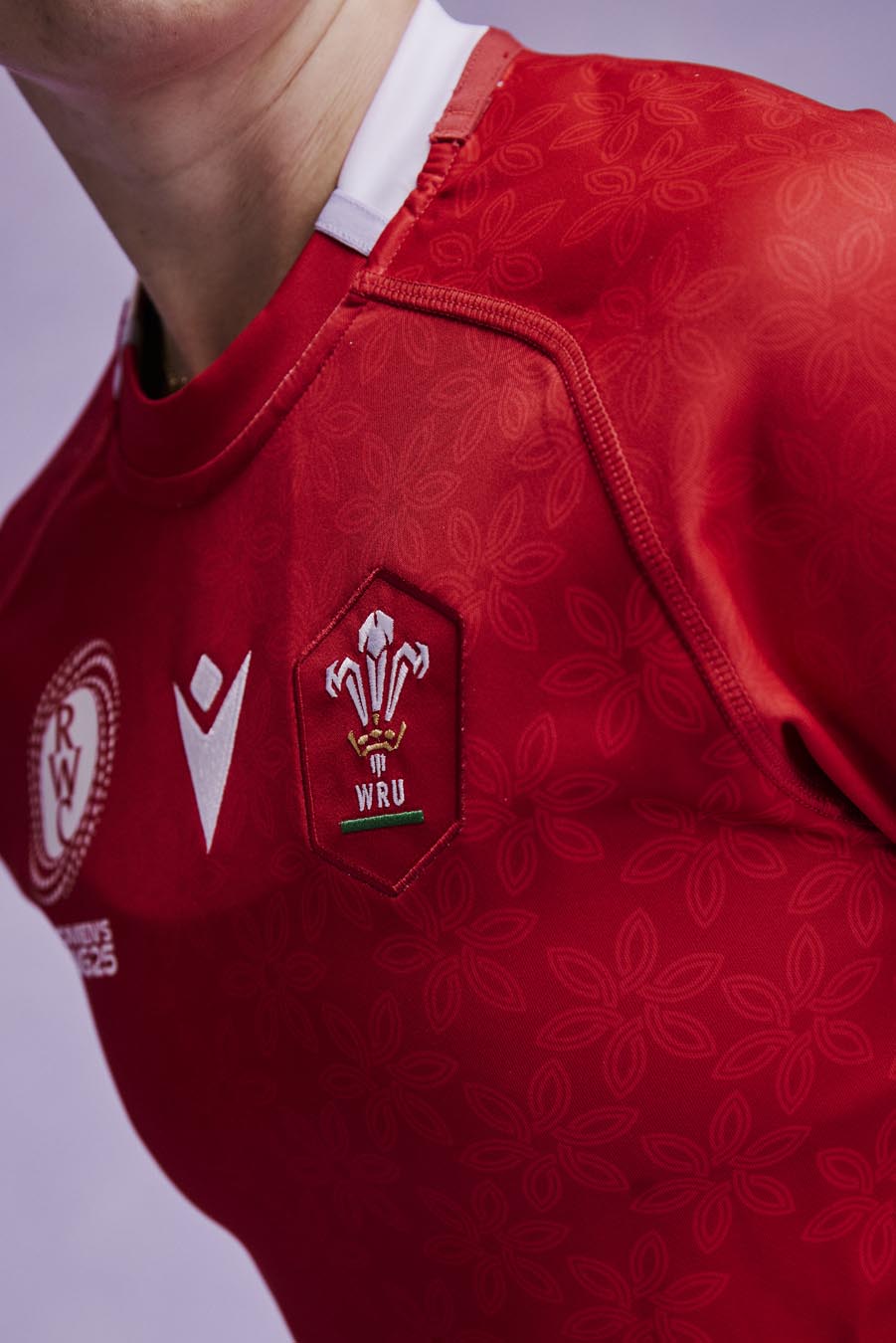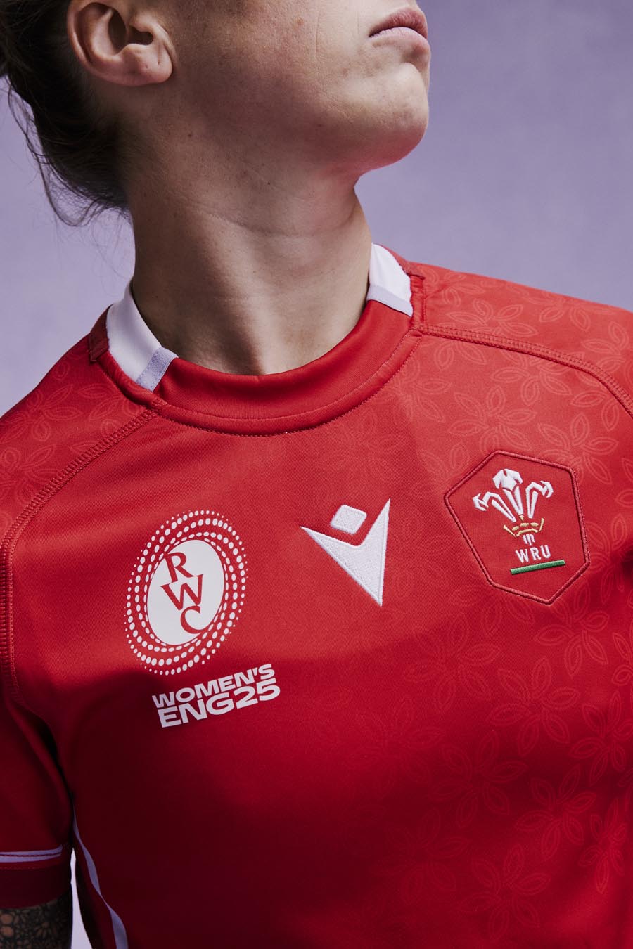 L’Home Kit WRWC della Welsh Rugby Union è nella tradizionale tonalità di rosso, con girocollo arricchito da inserti bianchi. Nel corpo anteriore, sulle spalle e sulle maniche è presente una grafica in stampa sublimata con il disegno stilizzato e geometrico, ripetuto tono su tono, del fiore di narciso, uno dei simboli nazionali del Galles. Sul petto, a destra, è stampato il logo ufficiale della Coppa del Mondo, al centro del petto, ricamato in bianco, il Macron Hero, a sinistra, lato cuore, il logo della WRU. Nel fondo maglia posteriore, in grafica embossata, è presente la scritta CYMRU, ovvero ‘Galles’ in lingua gallese. Lo sfondo dell’etichetta nel backneck è personalizzata con sfondo che riprende la grafica del kit, sopra il quale compaiono anche lo stemma della Welsh Rugby Union, il logo Macron e la scritta ‘Designed in Bologna’, a certificare ed evidenziare come ogni capo sia ideato, progettato e sviluppato nel Macron Campus. I pantaloncini sono rossi con coulisse bianche e bande laterali che riprendono la grafica della maglia. I calzettoni bianchi hanno il bordo superiore rosso con linea orizzontale bianca.