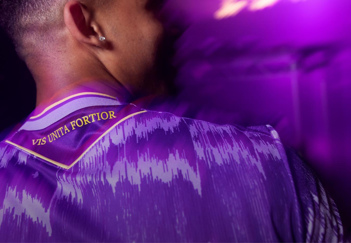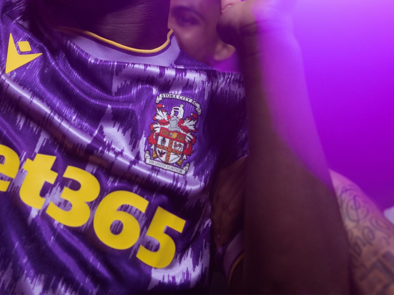 Sul petto, in stampa siliconata gialla, è applicato il Macron Hero, mentre a sinistra il logo che il club inglese ha utilizzato dagli anni ’50 al 1977 e successivamente proprio dal 1992 al 2001. Si tratta sostanzialmente lo stemma della città di Stoke-on-Trent, che proprio quest’anno festeggia il proprio centenario, così come 100 sono gli anni da quando il club ha aggiunto ‘City’ al proprio nome. Sotto al logo è riportata la frase latina VIS UNITA FORTIOR, motto del club e della città, che si traduce in ‘La forza risultante dall’unione è più forte’ o più semplicemente ‘L’unione fa la forza’, è che è applicato in giallo anche nel retrocollo esterno. I pantaloncini, con coulisse gialle, riprendono completamente la stessa grafica della maglia. I calzettoni sono i tre tonalità di viola: viola scuro con banda superiore di una tonalità più chiara e bordo viola malva con riga gialla. La nuova ‘Away’ e tutti i capi tecnici realizzati da Macron per lo Stoke City FC sono disponibili nello spazio dedicato al club inglese sul sito macron.com.