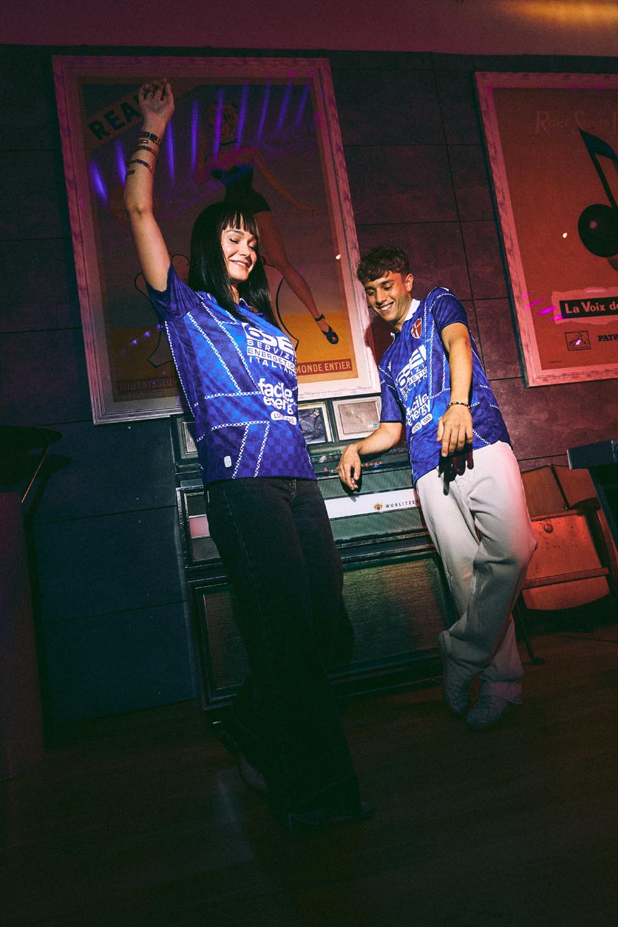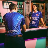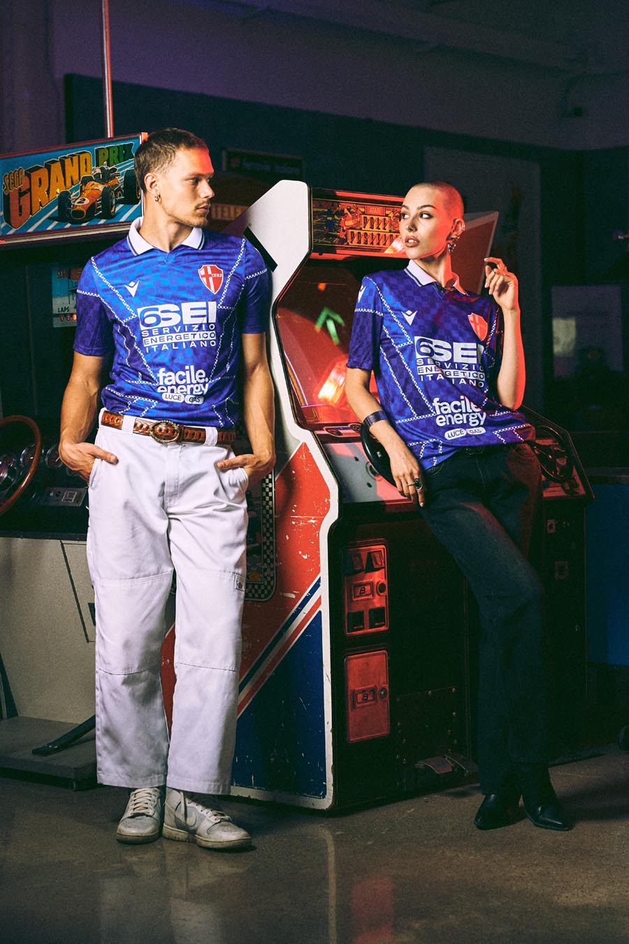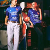 Sia le parti in blu acceso che quelle in blu scuro sono caratterizzate al proprio interno da un pattern sublimato tono su tono a scacchiera, con l’aggiunta alternata del dettaglio della croce presente nel logo del club. Anche i profili delle bande diagonali sono caratterizzati da un pattern a scacchiera, ma in questo caso con quadrati più piccoli e alternati tra bianco e blu acceso. Il Macron Hero, logo del brand italiano, è ricamato sul lato destro del petto, affiancato a sinistra dallo stemma del club.