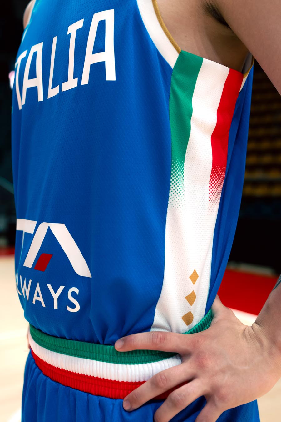 La nuova divisa Home dell’Italbasket è prevalentemente bianca, con canotta con collo a V e bordi manica bordati di azzurro e oro. L’elemento distintivo delle nuove divise è rappresentato dall’inserto laterale presente su entrambi i fianchi, caratterizzato da un tricolore verde-bianco-rosso che sfuma al bianco nella parte centrale, dove sono presenti tre piccoli rombi color oro. Al centro del petto in azzurro è presente la scritta ITALIA, mentre il logo della FIP in azzurro e il Macron Hero in oro sono applicati uno sopra l’altro sul lato destro.