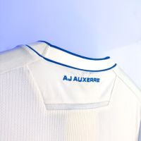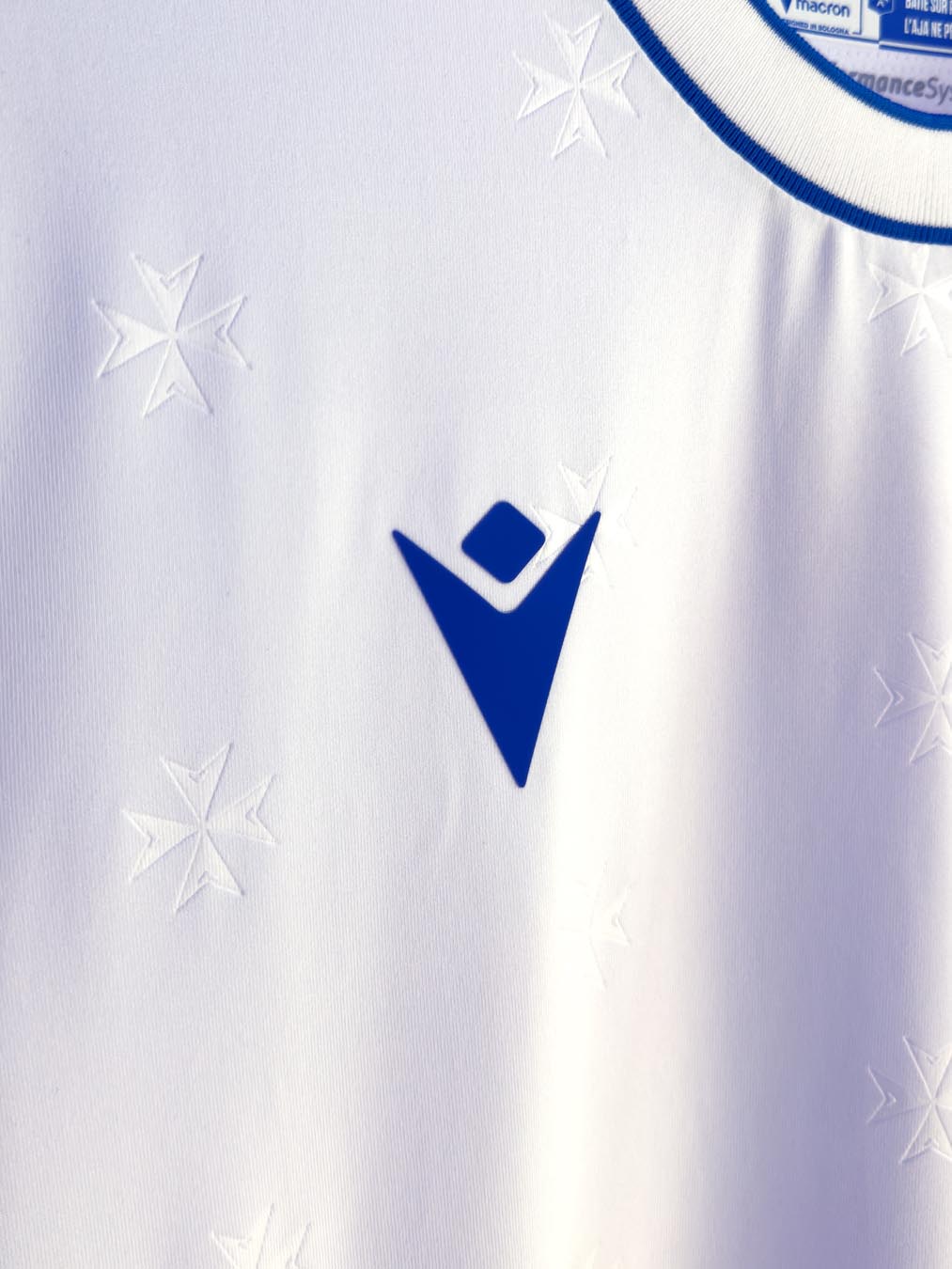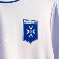 Il backneck è personalizzato dalla scritta ‘L’AJA EST BÂTIE SUR PIERRE, L’AJA NE PÉRIRA PAS’ (L’AJA è costruita sulla pietra, l’AJA non morirà), accanto il logo Macron, il logo del club e la dicitura Designed in Bologna, che certifica come ogni capo sia ideato, progettato e sviluppato presso il Macron Campus. Nel retrocollo esterno è ricamata in azzurro la scritta AJ AUXERRE e sul fondo maglia posteriore, in grafica embossata tono su tono, ritorna il disegno della croce di Malta.