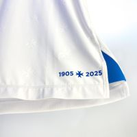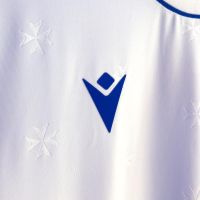 Sul petto, entrambi in stampa siliconata, a destra il Macron Hero, a sinistra lo stemma del club. A fondo maglia sono applicate in azzurro le due date 1905 2025, separate dalla croce di Malta.