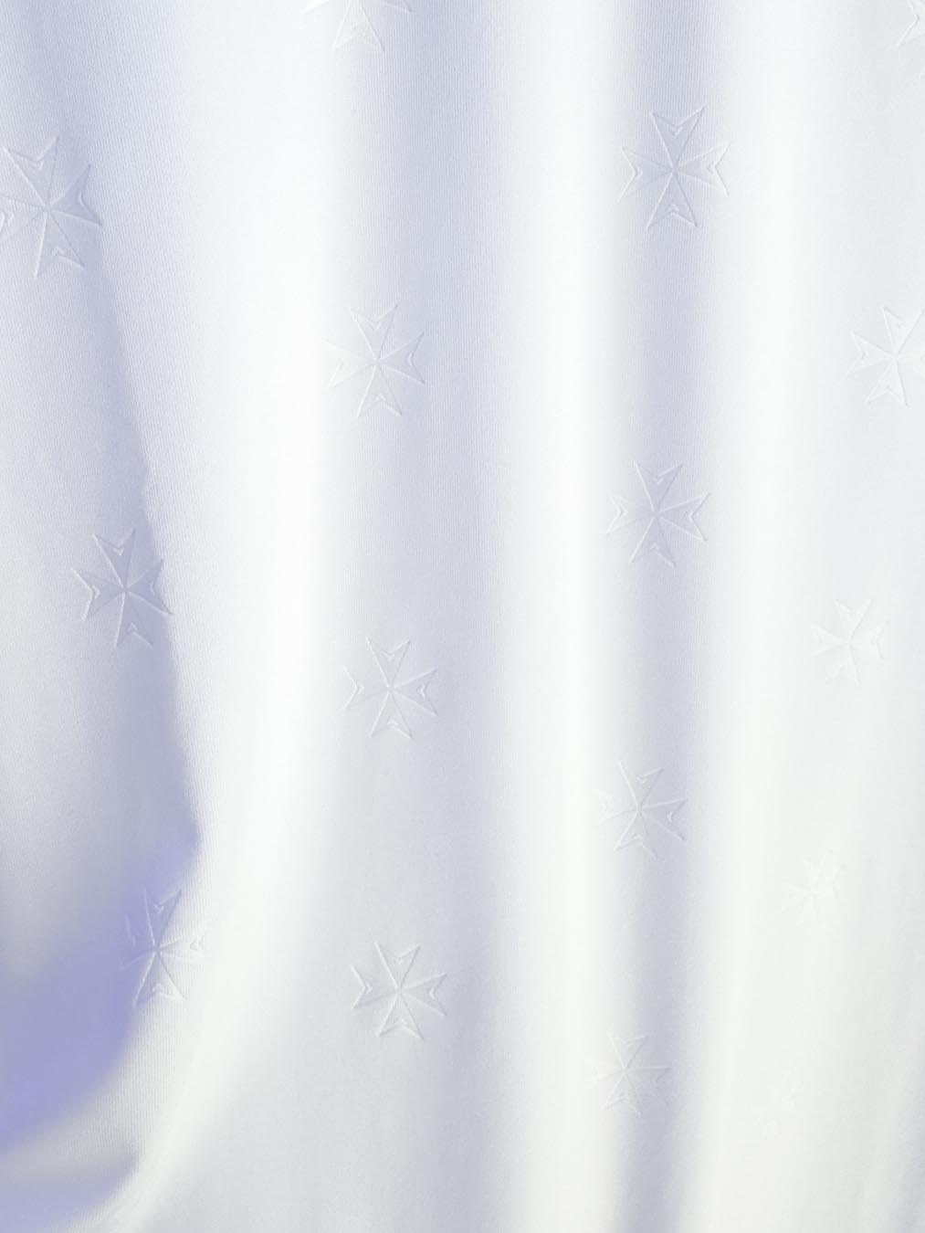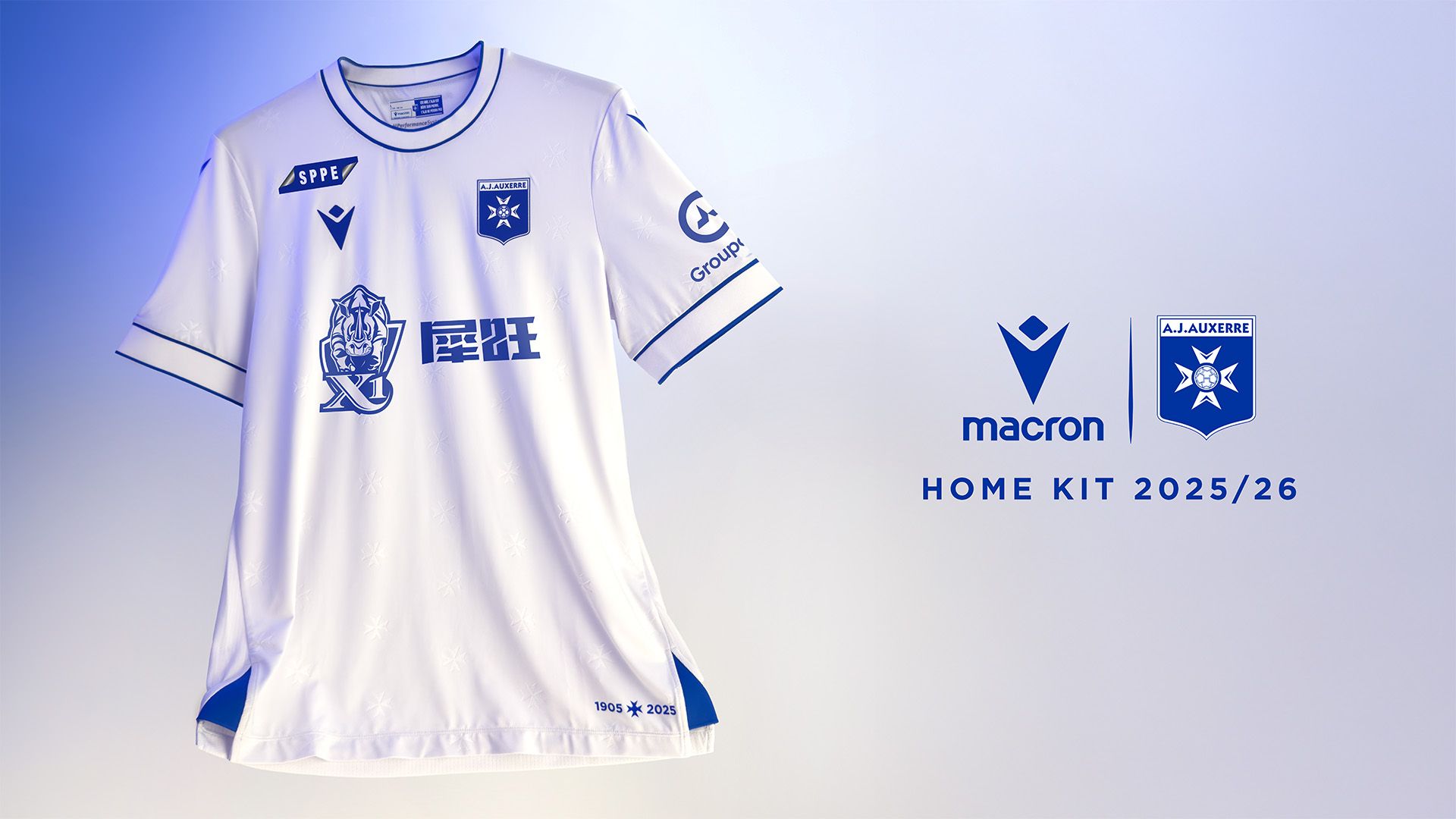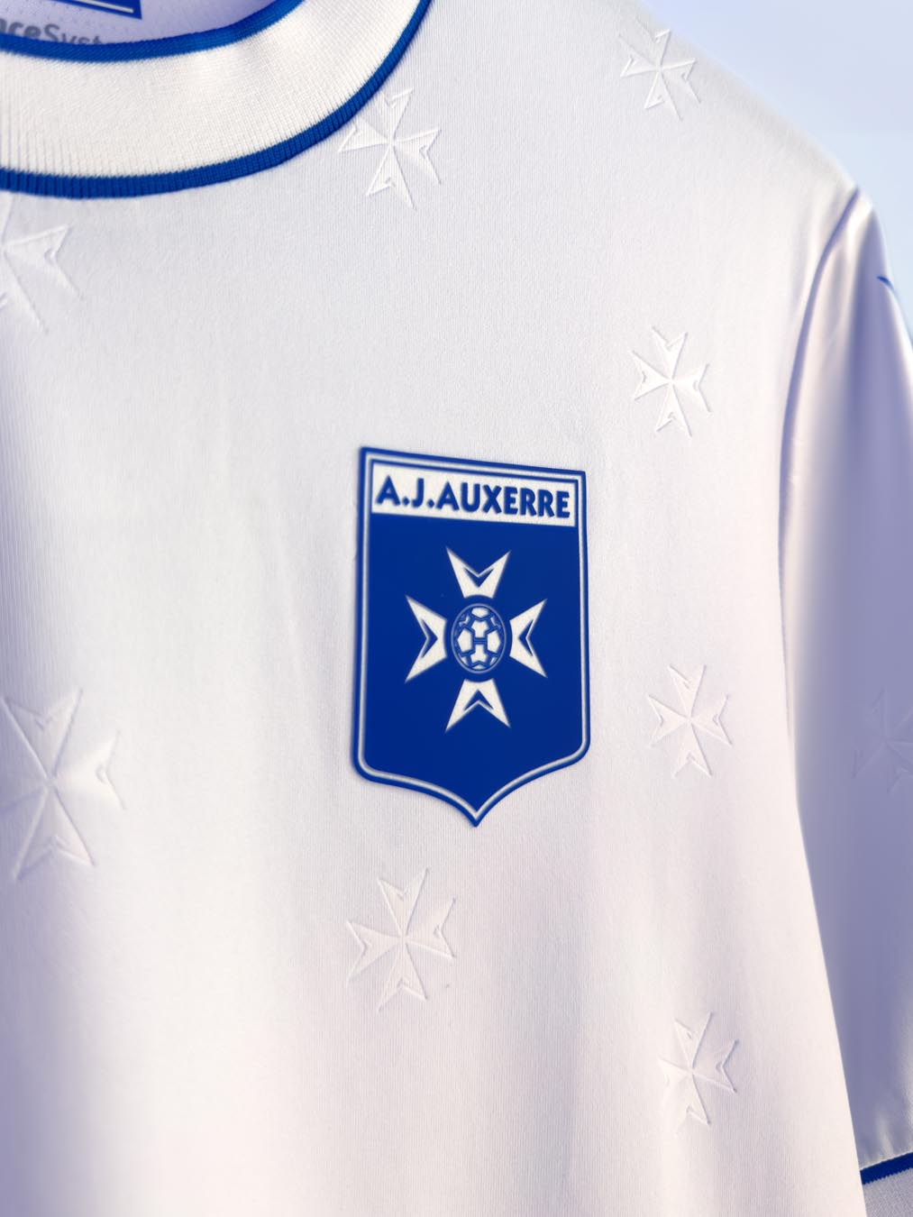 La nuova maglia Home 2025/26 dell’AJ Auxerre è bianca con girocollo e bordi manica delimitati da fini righe azzurre: i colori classici del club francese. Il kit è caratterizzato su tutta la superficie della parte anteriore e delle maniche dalla presenza di un pattern embossato composto dal disegno ripetuto della croce di Malta, simbolo del club presente anche nello stemma.