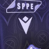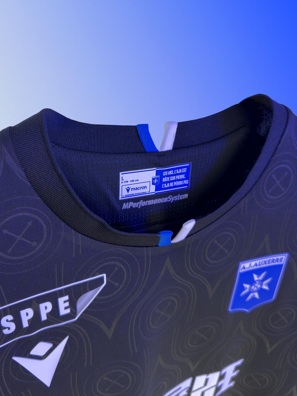 L’etichetta nel backneck interno è personalizzata con i colori dell’AJ Auxerre, il logo del club insieme alla scritta L’AJA EST BÂTIE SUR PIERRE, L’AJA NE PÉRIRA PAS (L’AJA è costruita sulla pietra, l’AJA non morirà). Accanto compaiono il logo Macron e la scritta Designed in Bologna, che certifica come ogni capo sia ideato, progettato e sviluppato presso il Macron Campus, Headquartres del brand italiano. Nel retrocollo esterno è ricamata in bianco la scritta AJ AUXERRE. Sul petto, in stampa siliconata bianca, il Macron Hero a destra, lo stemma del club a sinistra. I pantaloncini sono neri con coulisse bianche e dettagli biancoazzurri sul bordo coscia, completamente neri i calzettoni.