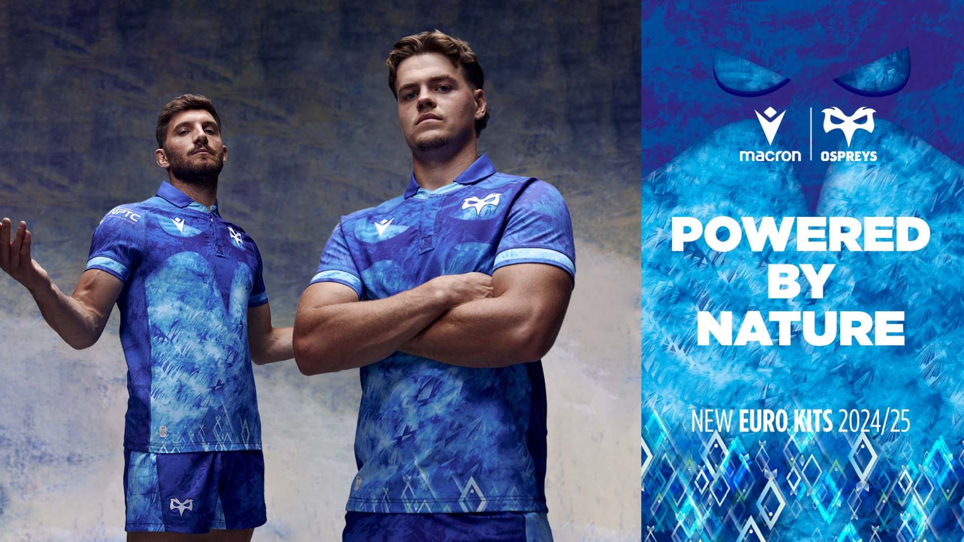Il nuovo game kit Euro degli Ospreys, con collo a polo con chiusura a due bottoni, è in due tonalità di azzurro, più scuro su spalle, petto, fianchi e parte posteriore, più chiaro nella parte centrale anteriore e sui bordi manica. La maglia è interamente caratterizzata da una grafica geometrica che richiama nel colore e nel disegno il ghiaccio, per sensibilizzare sul problema dello scioglimento dei ghiacciai dovuto al cambiamento climatico. La fusione delle due tonalità di azzurro ha però una doppia interpretazione, poiché oltre alla questione ambientale le sfumature delineano l’iconico logo del team.