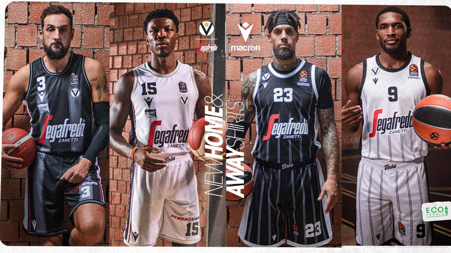 Per quanto riguarda il Game Set Eurolega, la ‘Home’ nera e la ‘Away’ bianca sono caratterizzate da un elegante rigato verticale composto da coppie di linee (bianche nella versione nera, nere in quella bianca) con effetto sfumato verso l’alto. Il girocollo e gli sbracci sono in bianco come la banda presente sui fianchi della maglia. Sul petto, a destra in stampa siliconata, il logo del club e poco sotto il Macron Hero, mentre a sinistra è applicata la patch della Turkish Airlines Eurolegue. Nel retrocollo esterno è stampato il tricolore italiano. Nel retro della maglia, sul fondo, è presente invece la scritta BOLOGNA. Il backneck è personalizzato con il logo e i colori della Virtus Segafredo Bologna insieme alla scritta IN ALTO STAT VIRTUS, accanto il logo Macron e la scritta ‘Designed in Bologna’. I pantaloncini neri per la Home, bianchi per l’Away, seguono il layout grafico delle maglie con le coppie di linee verticali con colore a contrasto e con la scritta Virtus al centro del bordo superiore.