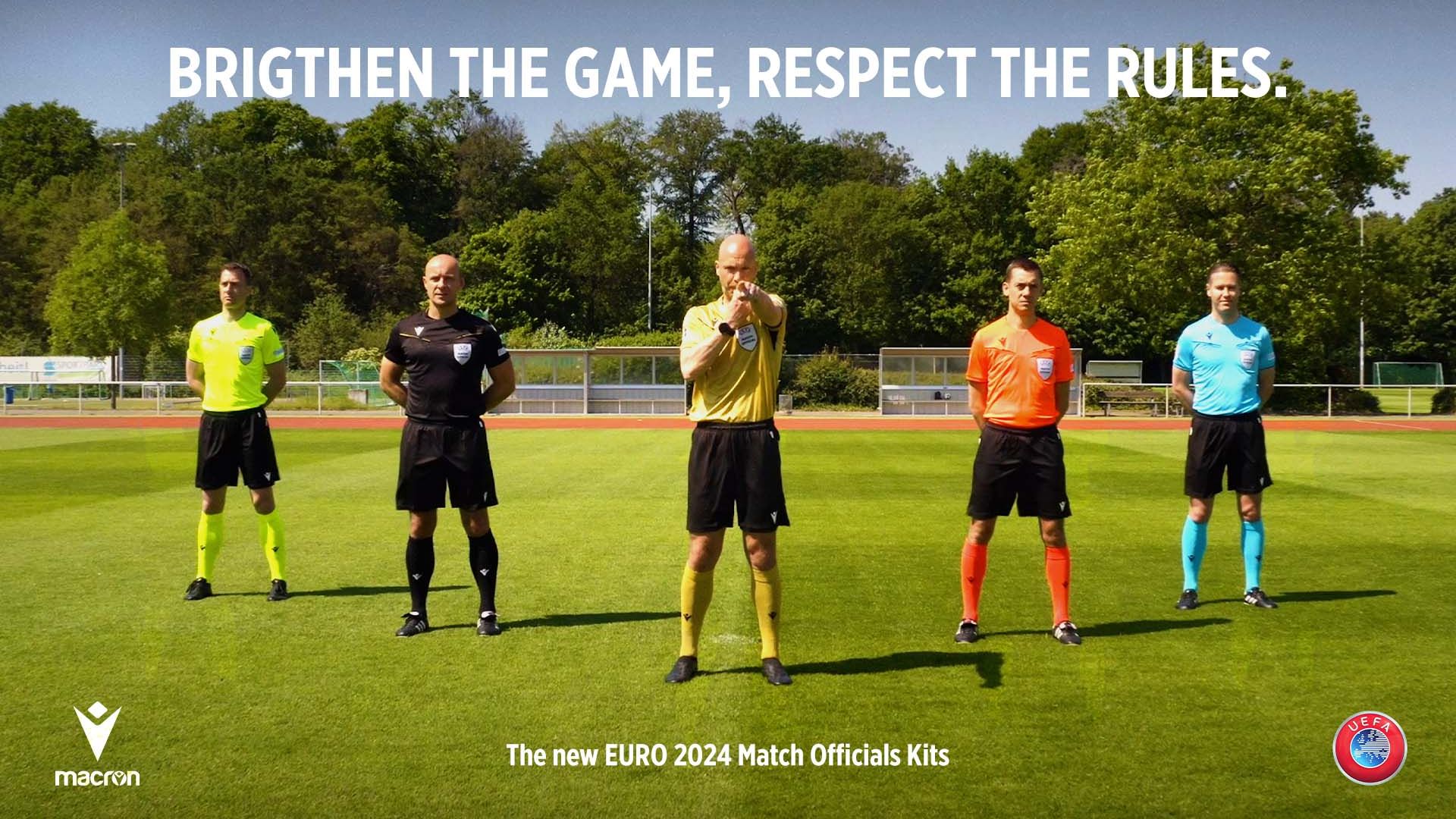 I nuovi kit che gli arbitri indosseranno nel corso della 17ª edizione dei Campionati Europei sono caratterizzati dalla grafica embossata presente sulla parte anteriore della maglia, che riprende il tema grafico ufficiale della competizione europea. Il richiamo alle grafiche della competizione è presente inoltre anche nel retrocollo esterno, dove una sottile linea riprende i colori del logo ufficiale del torneo, a sua volta ispirato alle bandiere delle differenti nazionali partecipanti. Il game set prevede quest’anno, oltre ai colori rosso fluo, azzurro fluo e giallo fluo, anche una versione nera con dettagli oro e una nuova versione interamente Gold. I calzettoni sono coordinati nello stesso colore della maglia, mentre i pantaloncini sono sempre neri. Sul petto, in nero, il Macron Hero e a sinistra lo stemma UEFA Match Official, mentre sulle maniche, a destra è presente la patch di EURO 2024, a sinistra quella di “UEFA FOUDATION for children”. Su tutte le maglie degli ufficiali di gara impiegati durante la competizione sarà inoltre stampato il messaggio “BE A REFEREE”, claim della campagna della UEFA per incentivare sempre più giovani ad intraprendere la carriera di arbitro.