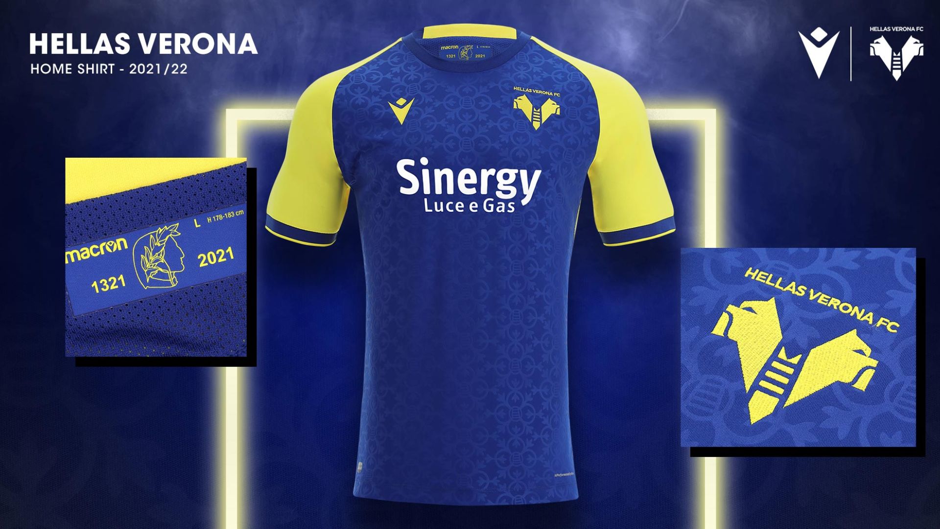 La nuova nuova maglia ‘Home’ è blu a girocollo in maglieria. Le maniche a raglan sono gialle con bordi blu. Il backneck è personalizzato con l’effige di Dante e le due date 1321-2021 su sfondo blu. La caratteristica grafica che contraddistingue la prima maglia dell’Hellas Verona è data dal disegno embossato, fronte retro, che richiama il particolare della cancellata delle Arche Scaligere (mausoleo della famiglia degli Scaligeri). Sul petto a destra è ricamato in giallo il Macron Hero, logo del brand italiano, a sinistra lato cuore, i Mastini, il logo dell’Hellas Verona. Nel retrocollo è ricamata, tono su tono, la scritta VERONA. Nel retro, sul fondo maglia interno, è stampata a caldo la frase ch’in te avrà sì benigno riguardo tratta dal canto XVII del paradiso.
