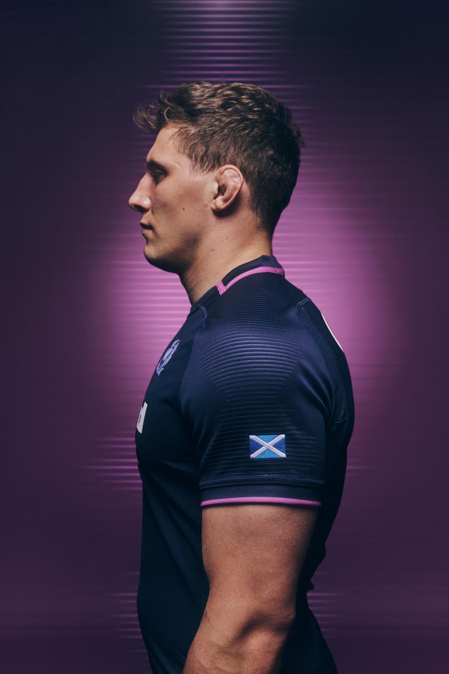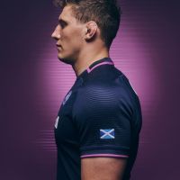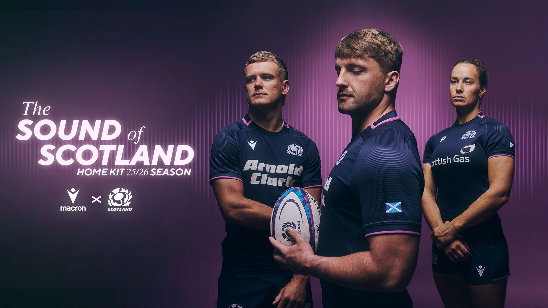 Per la maglia Home 2025/26, la Scottish Rugby Union e Macron hanno puntato su una jersey blu navy a girocollo con dettagli viola erica. La maglia è caratterizzata da due grafiche significative ed entrambe legate all’identità della Nazionale del cardo. Sulle maniche, sia davanti che dietro, è stampata la rappresentazione dell’onda sonora del coro dei tifosi che cantano SCOTLAND! SCOTLAND! SCOTLAND! SCOTLAND! Una parola, Scotland, che ritroviamo stampata in rilievo e in forma ripetuta, in parte sul fondo maglia anteriore e su tutto il fondo maglia posteriore.
