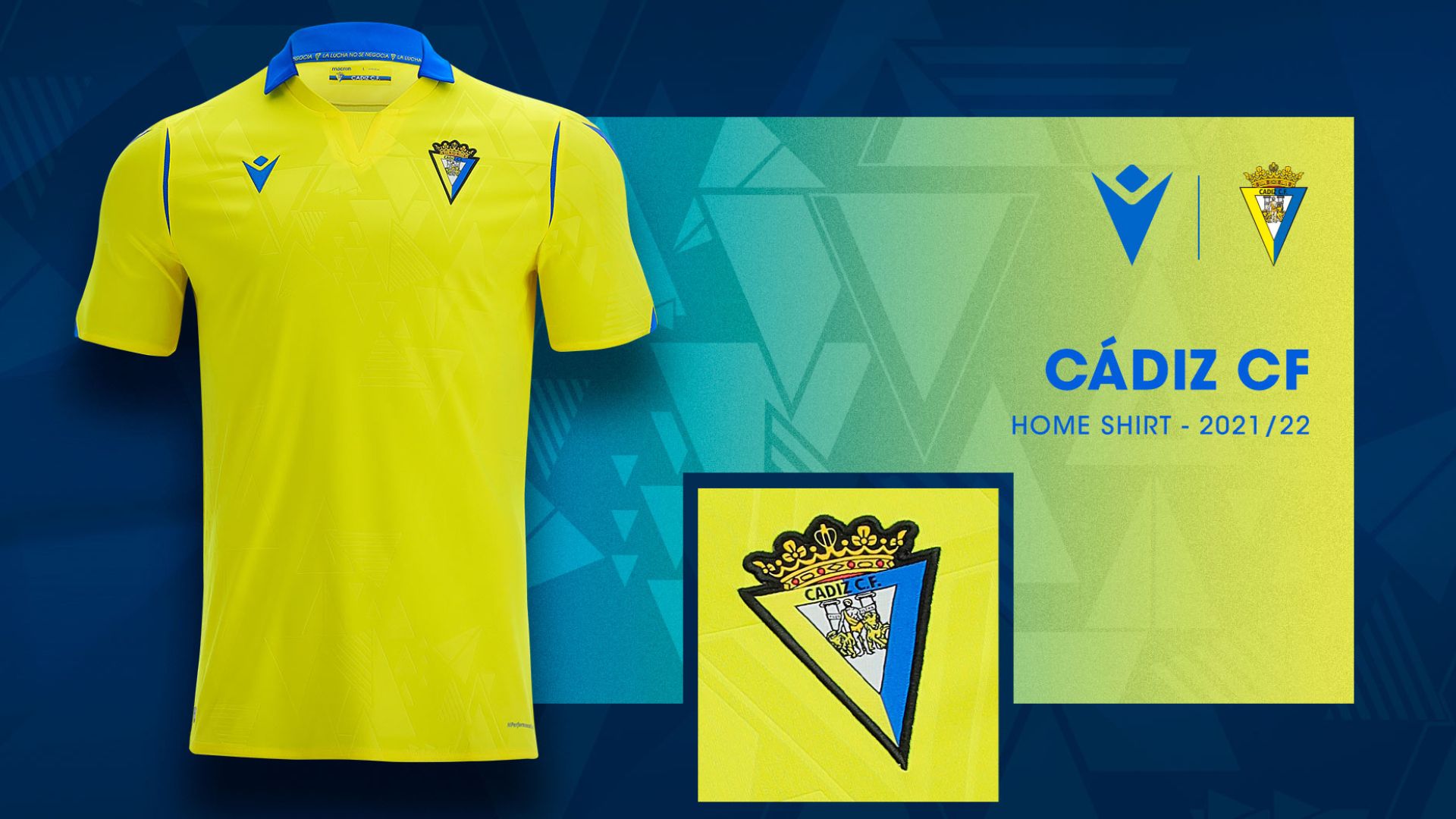 Il triangolo che contiene gli elementi dello stemma del Cádiz CF è anche il soggetto della grafica che caratterizza la maglia Home. Nella parte anteriore e sulle maniche sono infatti inseriti, in grafica embossata e tono, una serie di triangoli, diversi per forma e contenuto. Sul petto, a destra e in blu, è ricamato il Macron Hero, logo del brand italiano, a sinistra, lato cuore, la patch con il logo del club andaluso.
