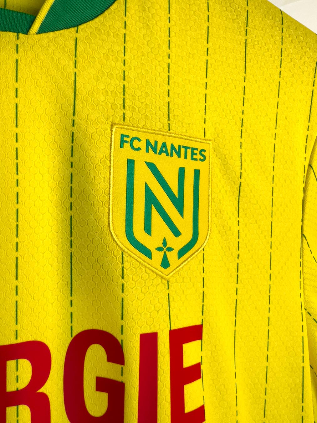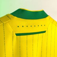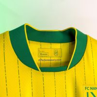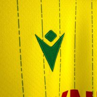 Il design della divisa Home 25/26 dell’FC Nantes resta fedele ai colori iconici del club: su fondo giallo spiccano sottili righe verticali verdi, presenti su fronte e retro, ottenute con una grafica sublimata che alterna tratti e spessori diversi, donando dinamismo e personalità. Il colletto coreano in maglieria e i bordi manica sono anch’essi verdi, a richiamo dei dettagli principali.