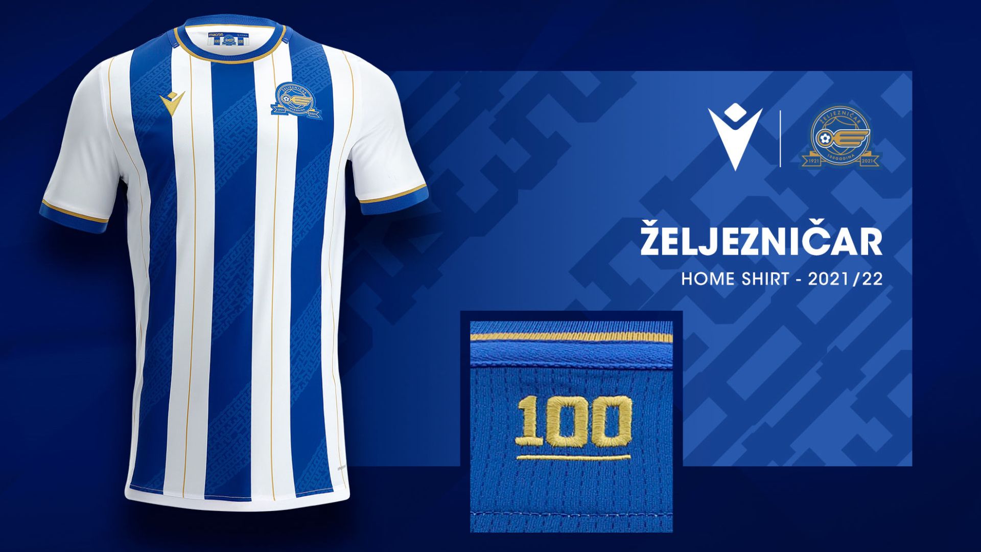 La nuova maglia ‘Home’ è caratterizzata dai colori bianco, blu e oro. Il corpo della maglia è bianco con tre bande verticali blu all’interno delle quali, in stampa sublimatica e tono su tono, sono inseriti, in diagonale, tutti i 100 anni (dal 1921 ad oggi) di vita del club. Nella parte bianca è anche presente una sottile linea verticale in oro. Le maniche sono bianche con bordi blu e sottile linea dorata. Il girocollo è blu con riga dorata e il backneck è personalizzato con lo stesso tema della maglia, il logo celebrativo dei 100 anni di storia inserito tra due 100 dorati. Nel retrocollo è ricamata in oro la cifra 100. Sul petto, a destra, è ricamato in oro il Macron Hero, logo del brand italiano, a sinistra, lato cuore, il logo celebrativo del centenario dell’FK Željezničar.