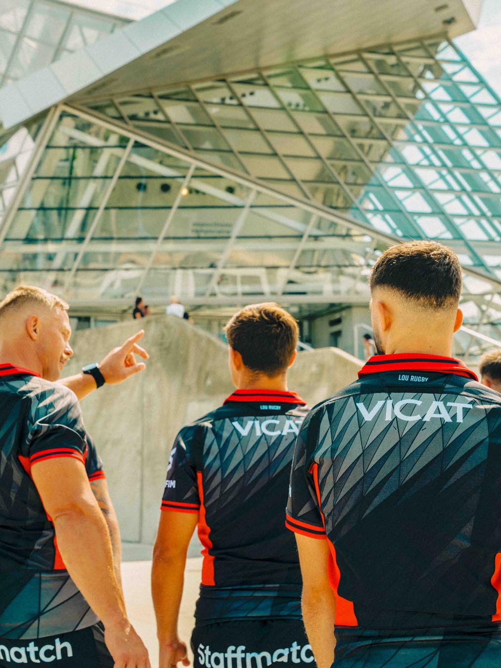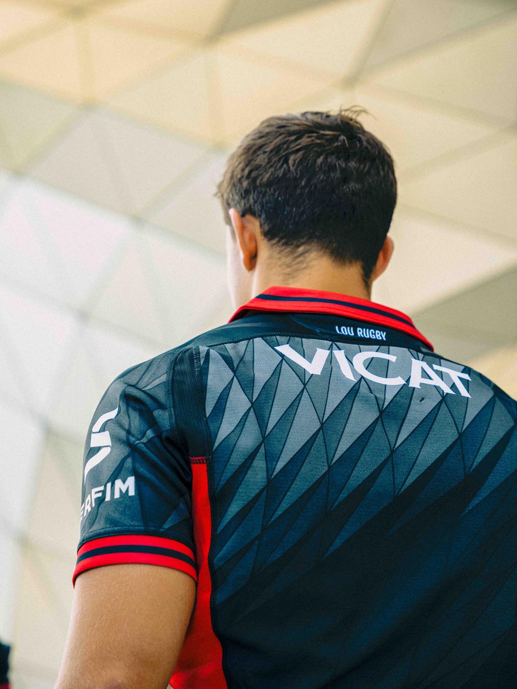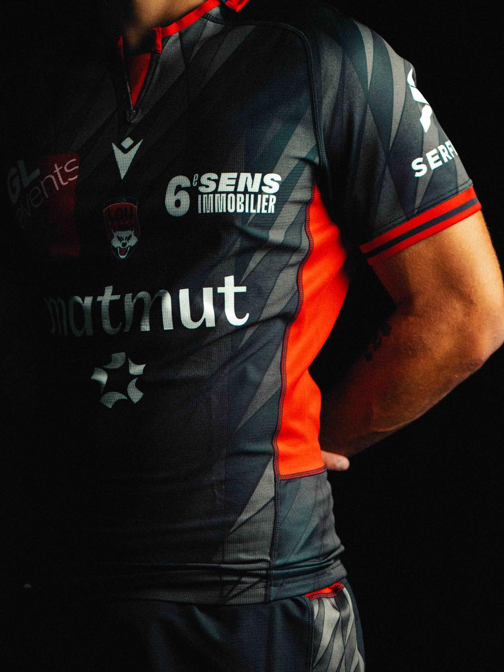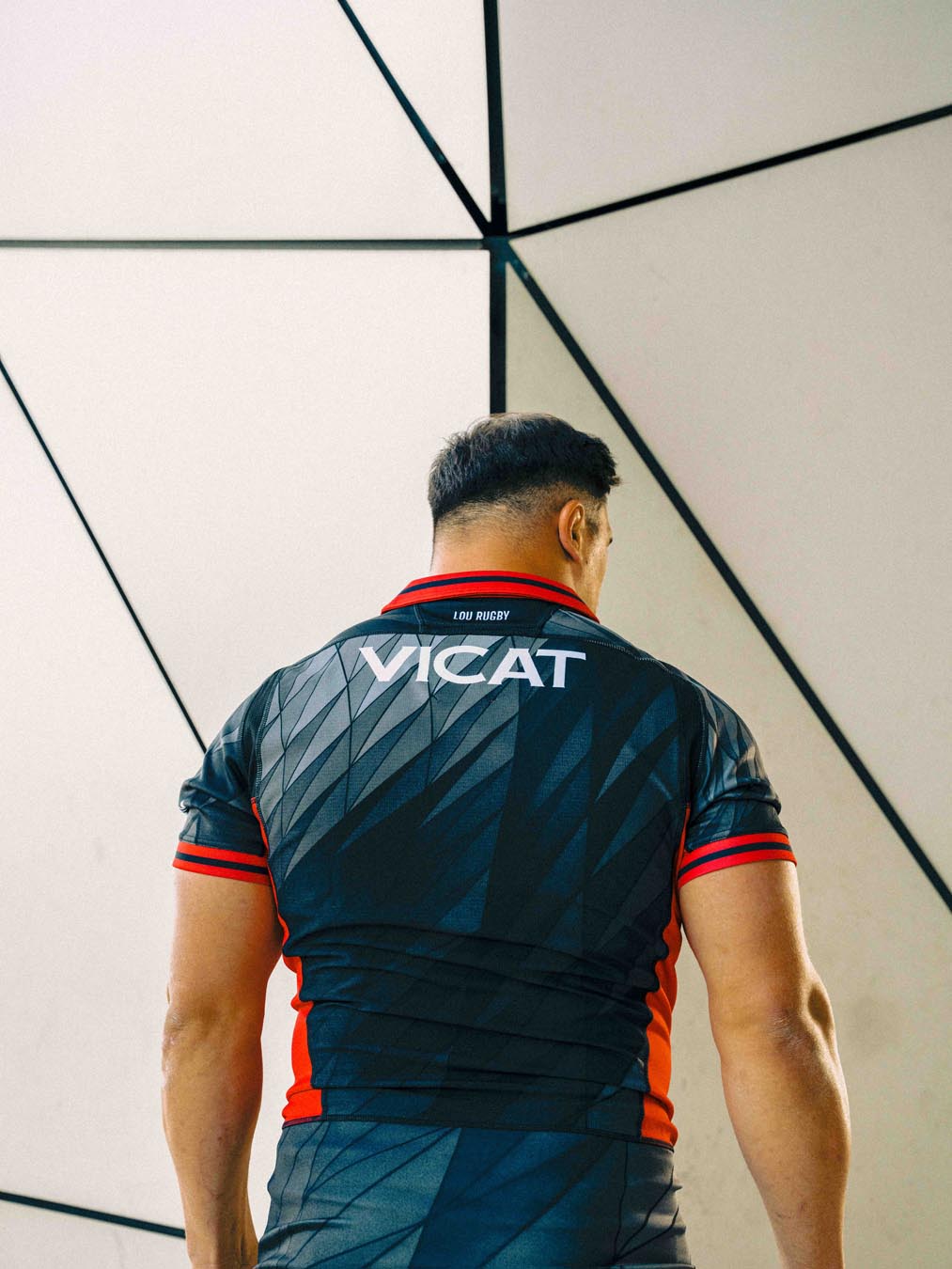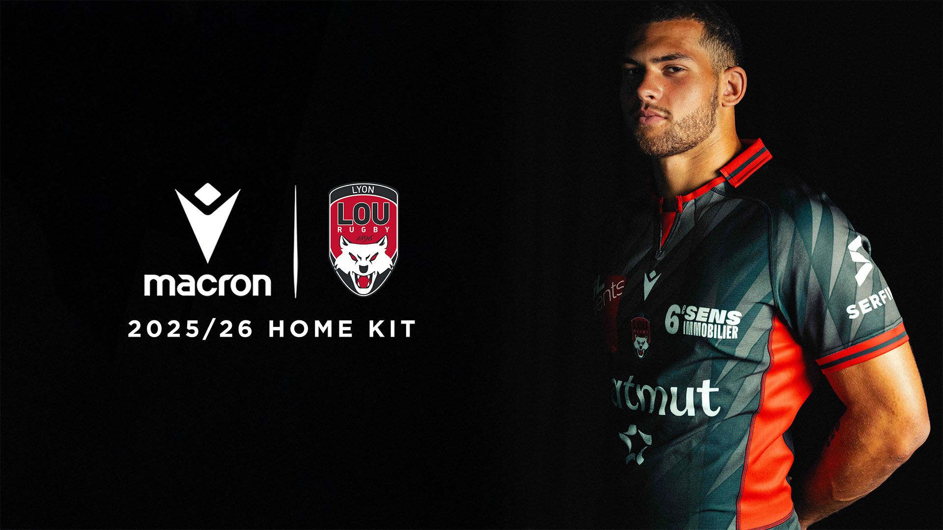 La nuova Home 2025/26 del LOU Rugby ha il collo a polo rosso con riga nera, abbinamento cromatico presente anche sui bordi manica. La maglia è prevalentemente nera con bande rosse sui fianchi, ed è caratterizzata da una grafica geometrica all-over e tono su tono, con effetto sfumato in varie tonalità che spaziano dal grigio al nero. Il riferimento è alla facciata in vetro del Musée des Confluences, edificio che con la sua struttura moderna e innovativa rappresenta un vero e proprio vanto per città di Lione.