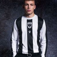 La maglia si distingue per un design essenziale ed elegante, ispirato ai capi storici del club. Le ampie bande verticali bianconere si alternano sia sulla parte anteriore che posteriore e sulle maniche, con una costruzione pulita che richiama l’estetica calcistica del passato. Il fit è Slim, con collo a girocollo in maglieria e dettagli curati che esaltano il carattere heritage del capo. Sul petto, posizionati al centro uno sotto l’altro, spiccano lo speciale stemma rétro del PAOK e il Macron Hero ricamato in bianco, a sottolineare la natura celebrativa del kit.