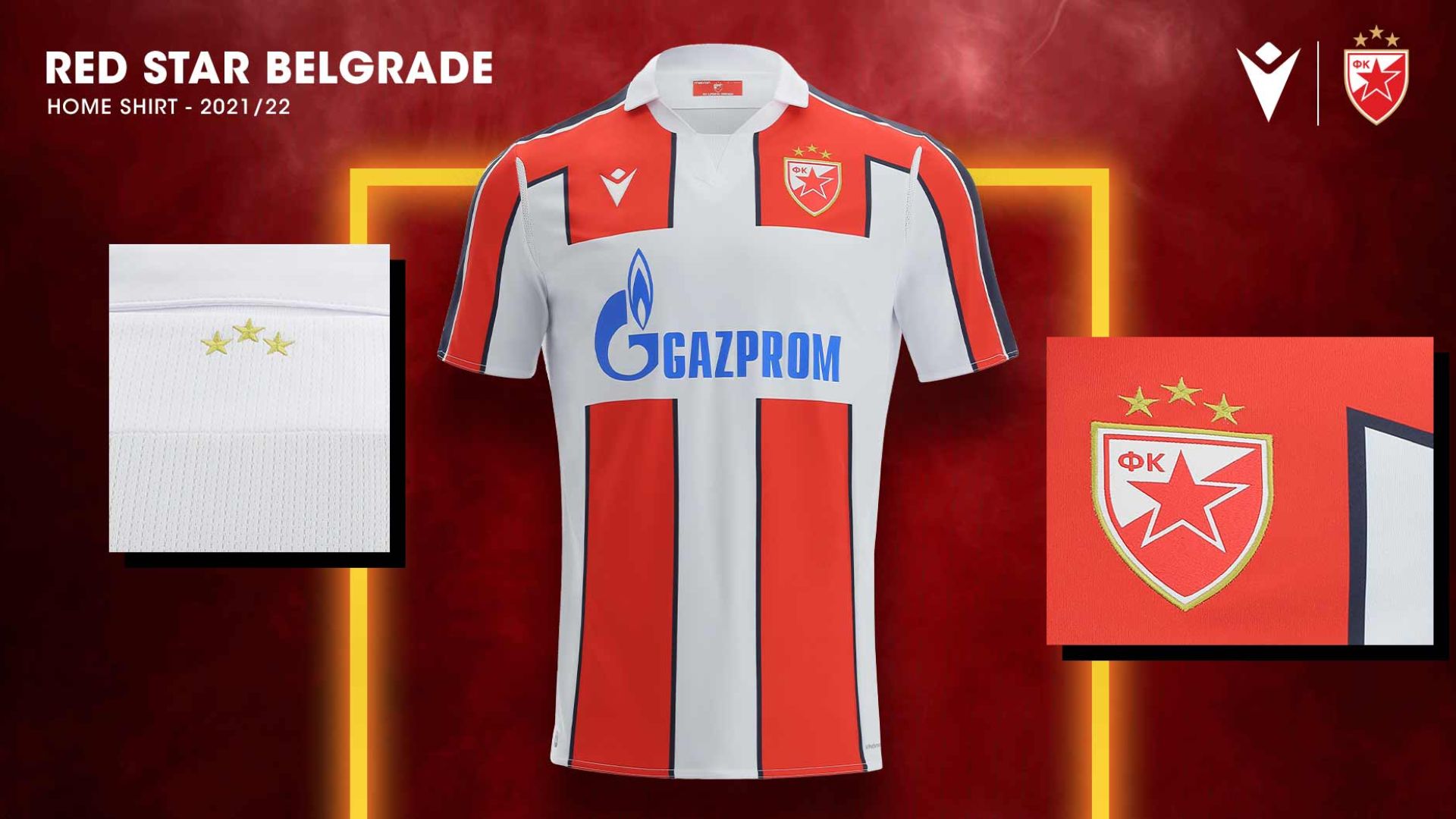 La nuova ‘Home’, tradizionalmente biancorossa, si ispira alla maglia della Stella Rossa Belgrado della stagione 1997-98 e indossata anche dallo stesso Stankovic, allora giocatore e capitano del club serbo, oggi allenatore. La maglia ha il collo a polo bianco ed è contraddistinta da due grandi bande verticali rosse ‘spezzate’ al centro e che continuano anche sulle maniche, dove è presente anche una banda in blu navy. il backneck è personalizzato da un’etichetta rossa con al centro lo stemma del club serbo e la scritta con il nome della squadra: ФК ЦРВЕНА ЗВЕЗДА.