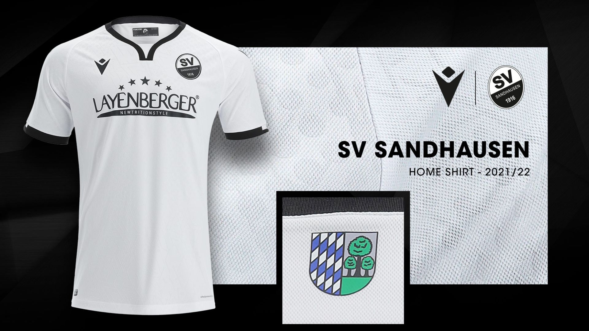 La nuova ‘Home” è bianca con collo alla coreana con bordi neri, come neri sono anche i bordi manica. Il backneck è personalizzato con il logo della squadra e la scritta AUS DEM HARDTWALD IN DIE HERZEN DER FANS. Sul petto a destra è ricamato in nero il Macron Hero, logo del brand italiano, a sinistra lato cuore il logo dell’SV Sandhausen. La maglia è caratterizzata dalla presenza, nel corpo anteriore e sulle maniche, di un disegno in grafica embossata astratta che grazie all’utilizzo del tessuto “piola” assume uno stile dal gusto retro, ma allo stesso tempo moderno e aggressivo. Il kit casalingo è completato da pantaloncini bianchi con bande nere laterali e da calzettoni bianchi con due righe orizzontali nere sul bordo superiore. Sulla calza, anteriormente, è presente il Macron Hero e sul polpaccio l’acronimo SVS.