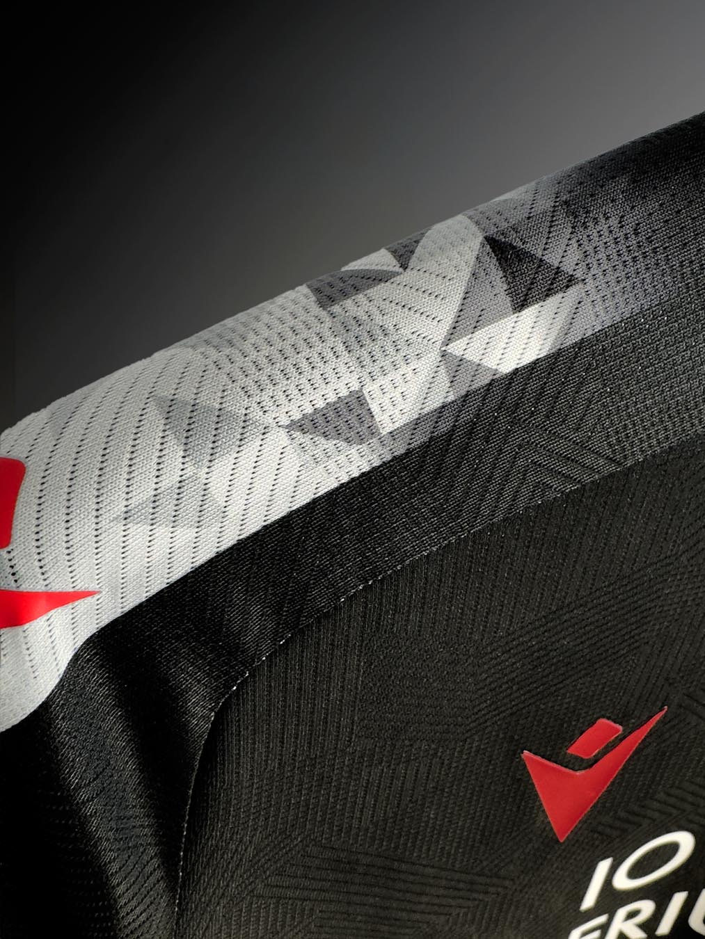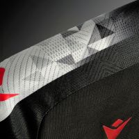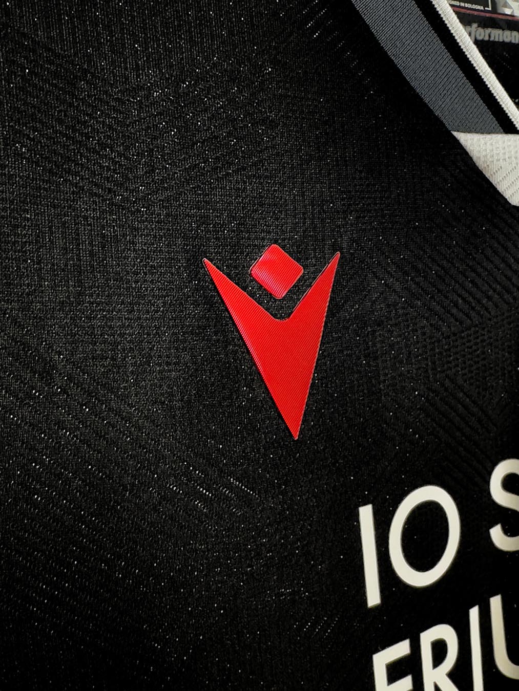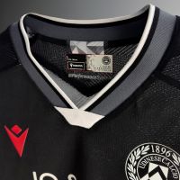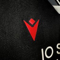 Il collo a V è rifinito con eleganti bordi grigi e bianconeri, dettaglio che viene ripreso anche sui bordi delle maniche, a completare un look distintivo. Il backneck della maglia è impreziosito da un’etichetta bianconera che richiama, nello sfondo, la grafica geometrica presente nelle parti bianche della divisa. Su di essa trovano spazio il logo dell’Udinese, la scritta “I PRIMI BIANCONERI D’ITALIA”, il logo Macron e la dicitura “Designed in Bologna”, che certifica ed evidenzia come ogni capo sia ideato, progettato e sviluppato all’interno del Macron Campus di Valsamoggia. Sul petto, a destra, in rosso e in silicone, il Macron Hero, a sinistra lo stemma dell’Udinese Calcio. Nel retrocollo esterno, in nero, è stampato il disegno dell’aquila linguata, simbolo identitario della regione del Friuli.
