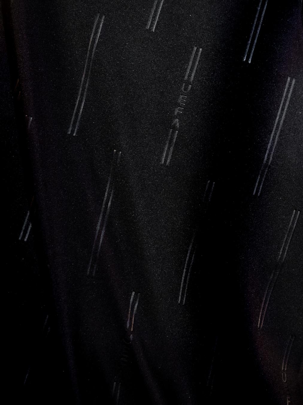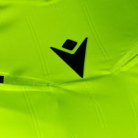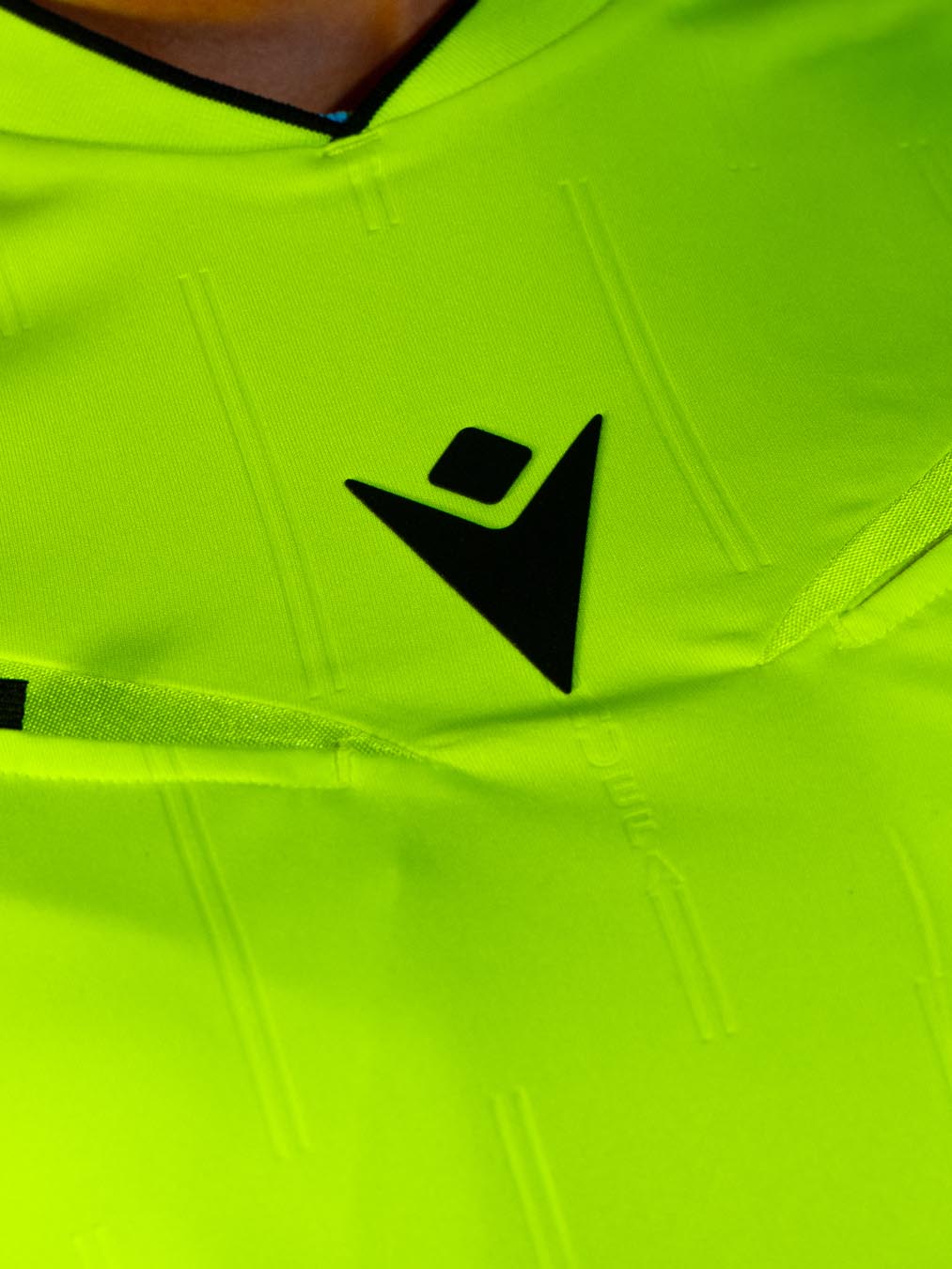 Il completo, caratterizzato da un elegante girocollo con bordo in maglieria, si distingue per la particolare grafica embossata sul corpo anteriore della maglia: coppie di sottili aste verticali che si interrompono in punti precisi per lasciare spazio alla scritta UEFA. Al centro del petto, in stampa siliconata, campeggia il Macron Hero, mentre a sinistra è presente lo stemma UEFA Match Official. Due inserti triangolari in tessuto lucido, posizionati all’altezza delle tasche frontali con chiusura in velcro, completano il look, aggiungendo un tocco di dinamismo visivo.