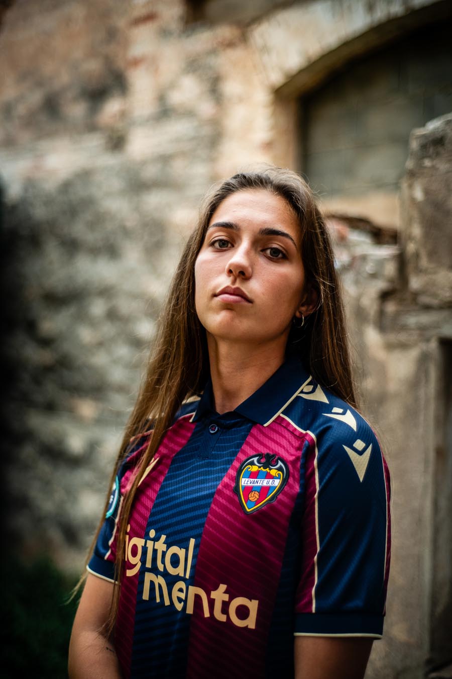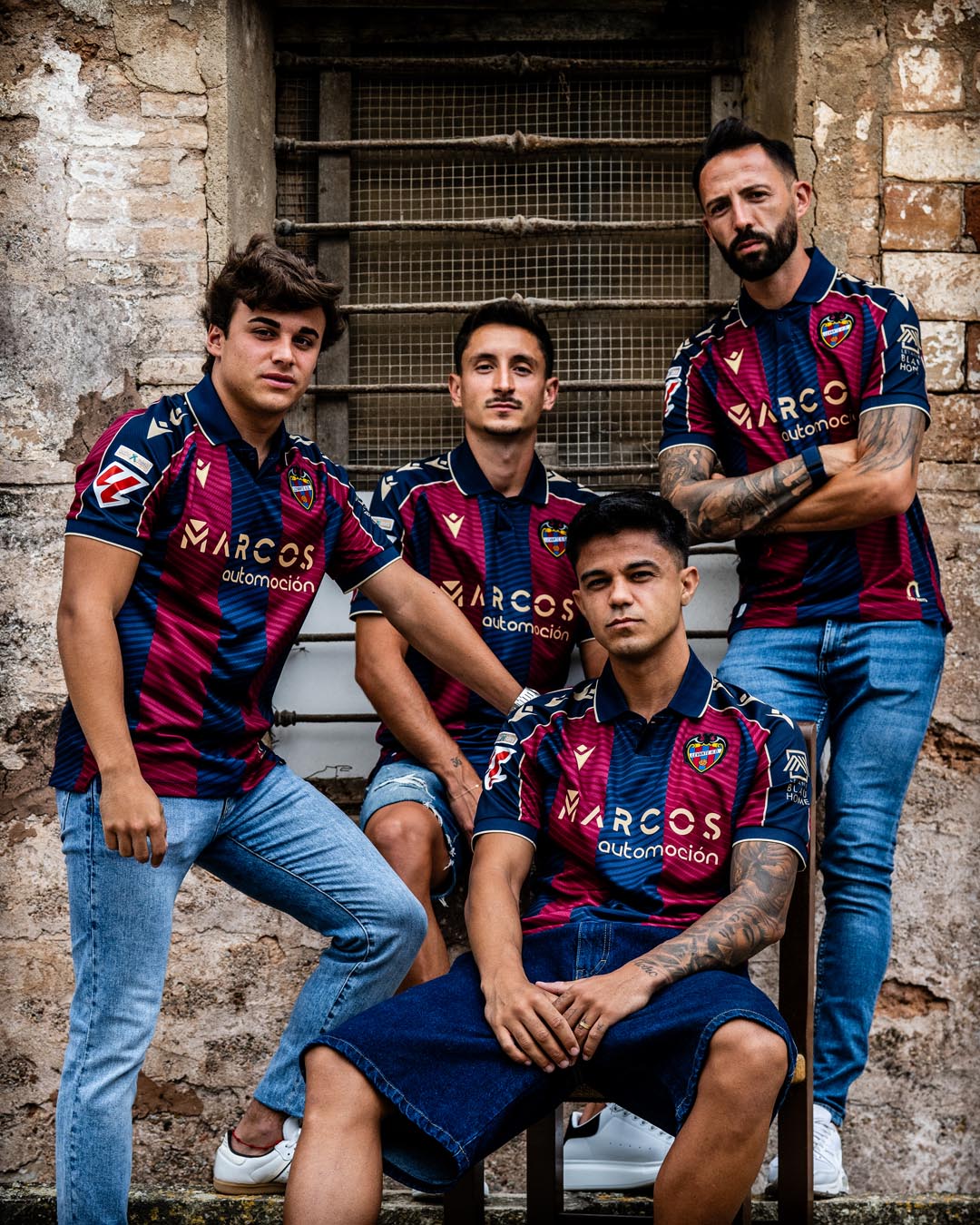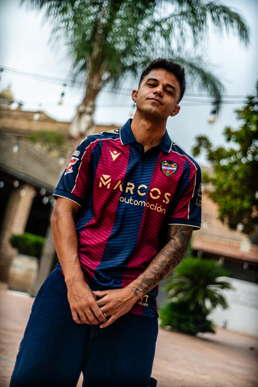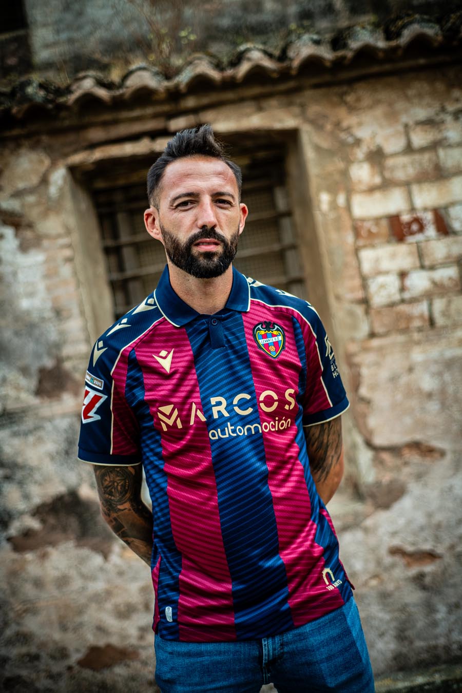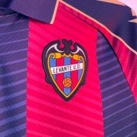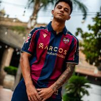 La nuova maglia Home 2025/26 del Levante UD mantiene il tradizionale abbinamento dei colori blu navy e granata, con ampie bande verticali, sia nella parte anteriore che posteriore, all’interno delle quali, tono su tono, sono presenti fini righe diagonali che creano un elegante effetto di movimento. Il collo è a polo di colore blu navy, realizzato in maglieria e con fine riga dorata a delimitare il bordo. Le maniche riprendono l’alternanza cromatica del corpo della maglia, ma con una banda blu navy a percorrere l’intero profilo delle spalle fino al bordo, delimitata da due sottili linee oro e personalizzata al proprio interno con tre Macron Hero color oro uno sopra l’altro. Il backneck è personalizzato con un’etichetta il cui sfondo riproduce un disegno raffigurante l’arco di ingresso del Campo de Vallejo, stadio nel quale il Levante ha giocato fino al 1968, e del quale quest’anno ricorre il centenario dalla sua costruzione. Sopra il disegno appare il logo del club valenciano, il logo Macron e la scritta ‘Designed in Bologna’ che certifica come ogni capo sia ideato, progettato e sviluppato nel Macron Campus. Sul petto, a destra e in oro, il Macron Hero, a sinistra la patch HD dello stemma del Levante UD.