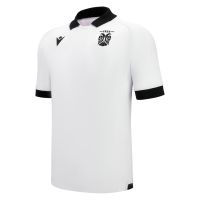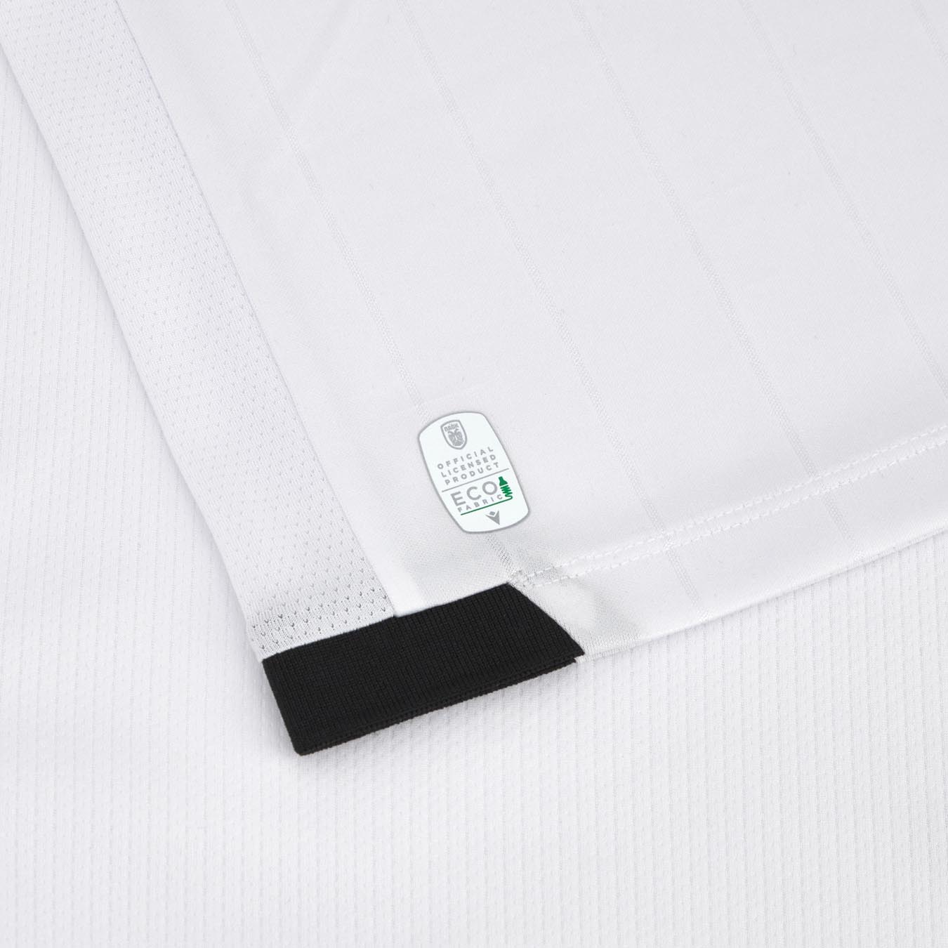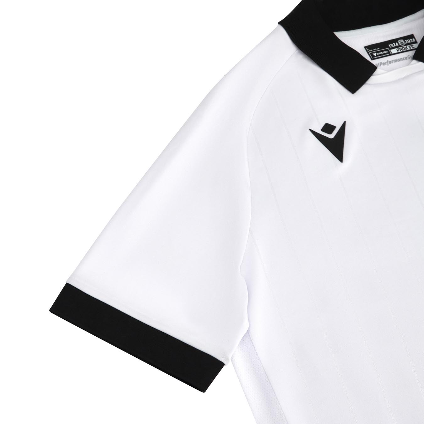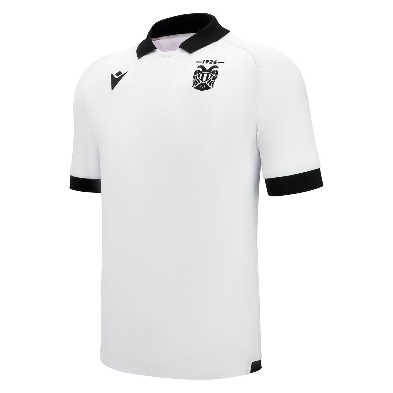 La maglia Third 2025/26 del PAOK FC è bianca con collo a polo e bordi manica neri, ed è caratterizzata da un fine ed elegante effetto gessato. Il corpo anteriore della maglia è infatti realizzato in Eco Lanman, un tessuto che presenta una lavorazione in grado di ricreare un sottile rigato direttamente nella propria trama, appena percepibile sia alla vista che al tatto. Sul petto è applicato a destra il Macron Hero in stampa siliconata nera, mentre a sinistra è cucito un particolare stemma del PAOK FC, composto solo dall’aquila bicipite sormontata da ‘1926’, anno di fondazione del club. I pantaloncini bianchi hanno coulisse e dettagli neri, i calzettoni bianchi con riga orizzontale nera sul bordo superiore.
