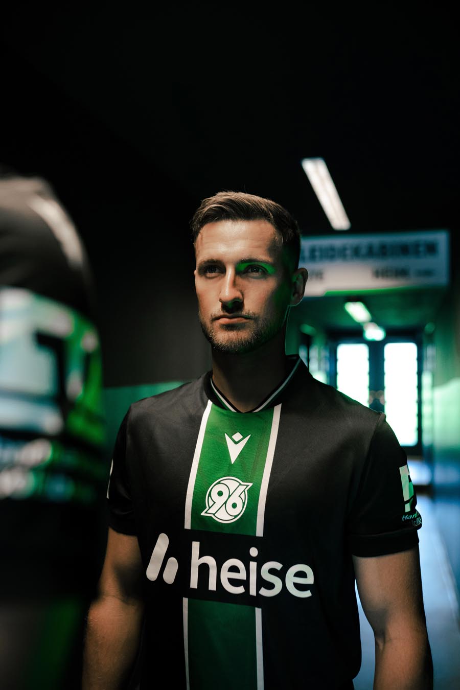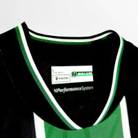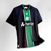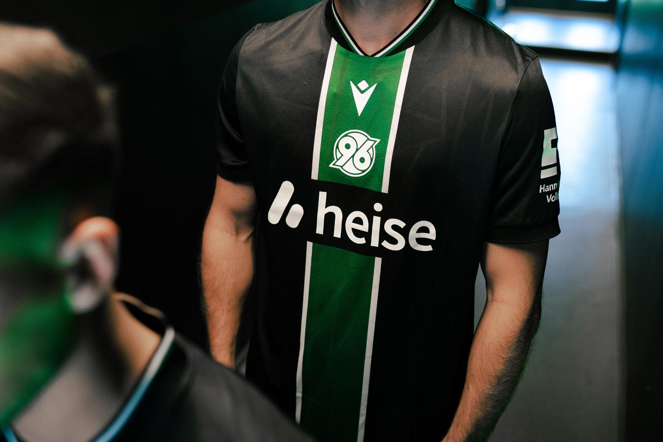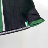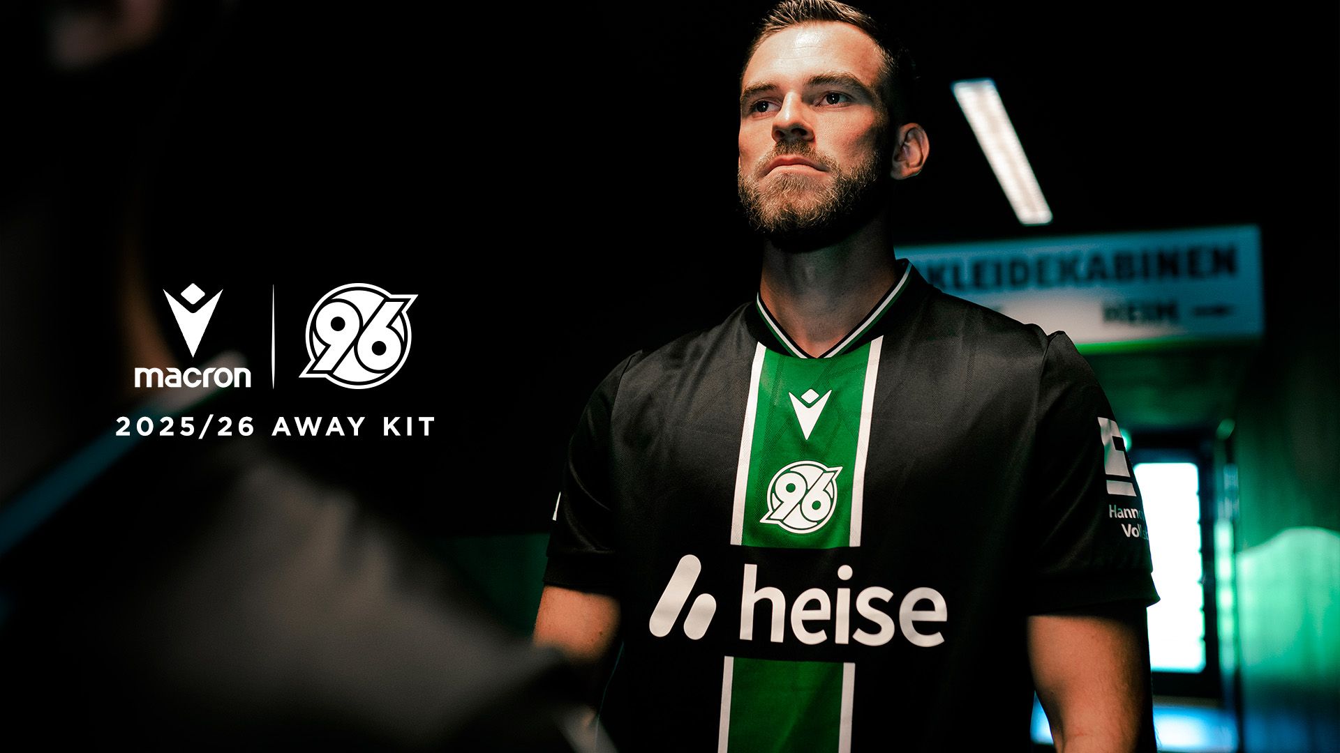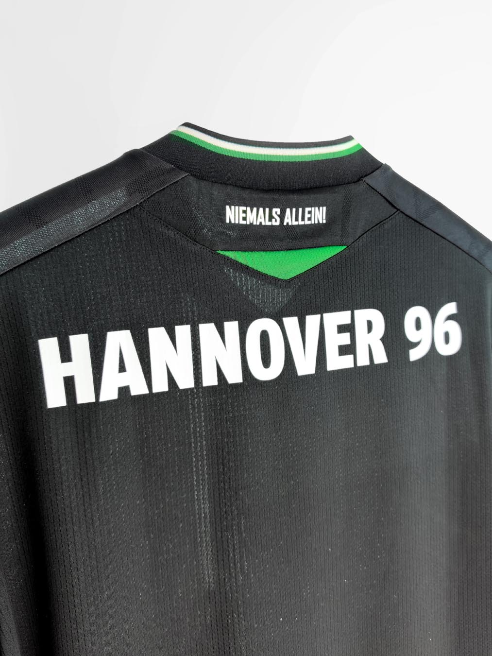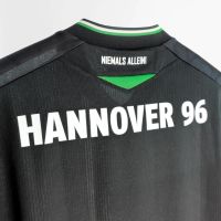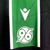 La nuova maglia Away 2025/26 dell’Hannover 96 è nera con collo alla coreana in maglieria bordato con fini righe bianche e verdi. Al centro della maglia è presente un’ampia banda verticale verde incorniciata tra due fini righe bianche. All’interno della banda verde, sul petto, uno sotto l’altro e in stampa siliconata bianca, sono presenti il Macron Hero e il logo del club tedesco. Il backneck è personalizzato con il logo della squadra, sfumato anche sullo sfondo dell’etichetta, il motto “NIEMALS ALLEIN!” (“Mai da soli!”), il logo Macron e la scritta ‘Designed in Bologna’ a certificare ed evidenziare come ogni capo sia ideato, progettato e sviluppato in collaborazione col club nel Macron Campus. Nel retrocollo esterno, in bianco, è riproposto il motto NIEMALS ALLEIN!