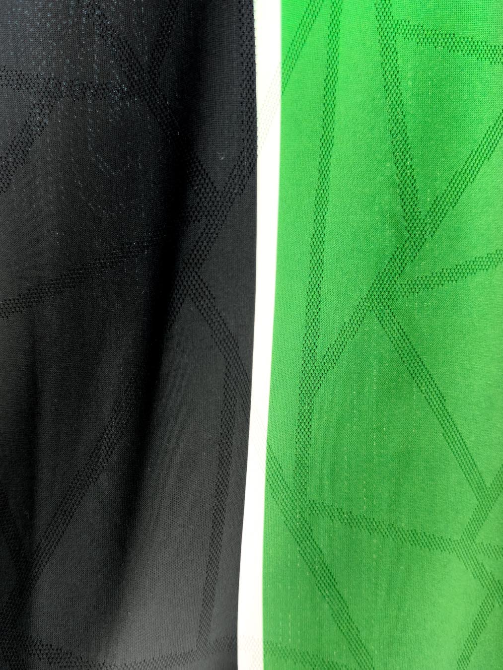 Completano il kit i pantaloncini neri con coulisse bianche e puntali verdi, mentre i calzettoni neri hanno al centro un’ampia banda orizzontale verde con due righe più sottili bianche.