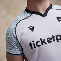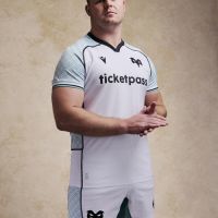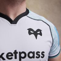 La nuova maglia Away 2025/26 degli Ospreys abbina invece il bianco al color ‘teal’, una tonalità ‘petrolio’ chiara e tendente al verde, con dettagli neri intorno al collo a V, sui bordi manica e nelle cuciture. Le spalle, le maniche e i fianchi sono arricchiti da una grafica che propone, in verde petrolio su sfondo bianco e in forma ripetuta, il disegno del nodo celtico. Si tratta di un simbolo di legame, unione, amicizia, composto da linee che si intrecciano senza inizio né fine. Lo stesso nodo è riprodotto in stampa embossata nella parte anteriore sinistra della maglia. Nel retrocollo esterno è stampato in nero lo stemma della squadra, affiancato dall’acronimo OITC – OSPREYS IN THE COMMUNITY. Si tratta di una fondazione no-profit che svolge attività a favore della comunità e che insieme al club gallese ha contribuito ad attivare una serie di programmi in tema di sport e attività fisica, salute e benessere, istruzione e occupazione. Come nella versione Home, sul fondo maglia posteriore appare infine in stampa embossata il profilo del futuro stadio del club a St. Helen’s, con all’interno lo stemma della squadra. Il kit è completato da pantaloncini bianchi con bande laterali verde petrolio che riprendono la grafica con i nodi celtici. I calzettoni bianchi hanno, poco sotto il bordo superiore, due righe orizzontali, una verde petrolio, l’altra nera.