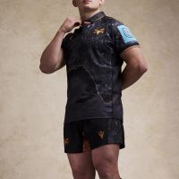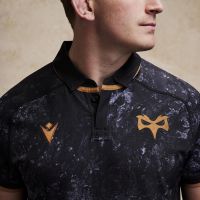 La nuova maglia Home 2025/26 degli Ospreys è prevalentemente nera, con dettagli color rame nel colletto alla coreana e sui bordi manica. La maglia è caratterizzata da una grafica sublimata presente sia sul corpo che sulle maniche, con una rappresentazione tono su tono della mappa della baia di Swansea e del più ampio territorio rappresentato dagli Ospreys. A questa grafica si aggiunge inoltre un design in outline che rende omaggio al futuro stadio degli Ospreys a St. Helen’s. Sul petto a destra è ricamato il Macron Hero, mentre a sinistra lo stemma del club, entrambi color rame. Il collo interno è personalizzato con un’etichetta con sfondo che riprende la grafica della maglia, lo stemma del club e la scritta OSPREYS, il logo Macron e la scritta ‘Designed in Bologna’ che certifica come ogni capo sia ideato, progettato e sviluppato presso il Macron Campus. Nel retrocollo esterno, in marrone chiaro, è stampato il profilo della futura casa del club a St. Helen’s, riproposto anche a fondo maglia in stampa embossata con all’interno lo stemma degli Ospreys. Il kit Home è completato da pantaloncini neri con coulisse rame e bande sui fianchi che riprendono la grafica della maglia. I calzettoni sono neri con riga orizzontale rame poco sotto il bordo superiore.