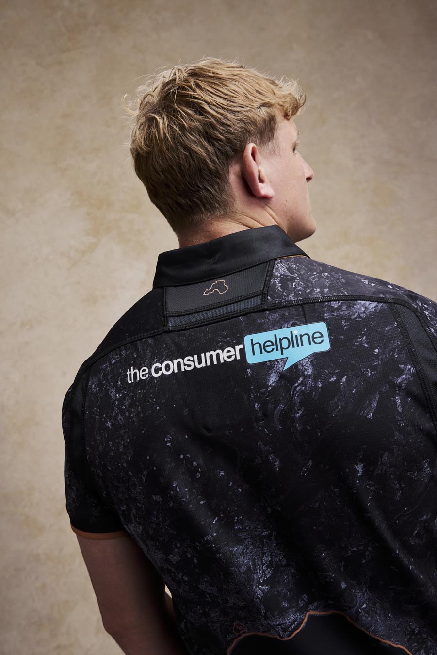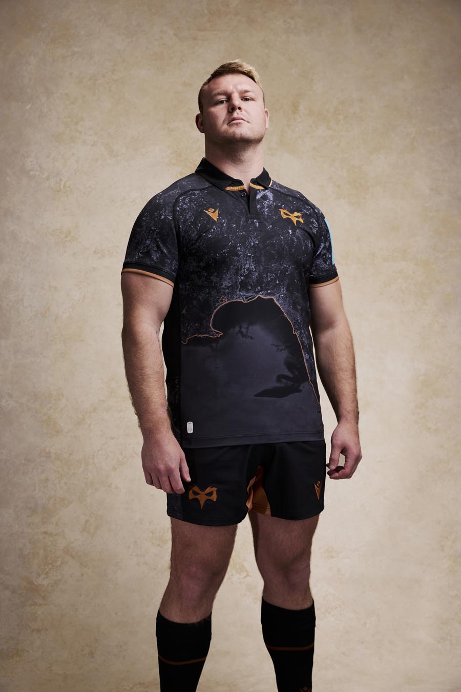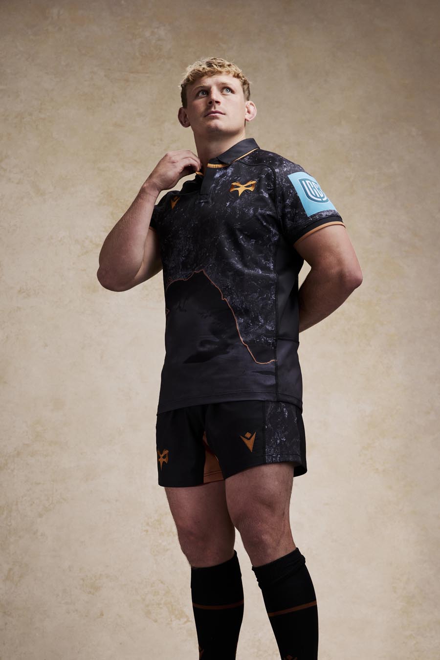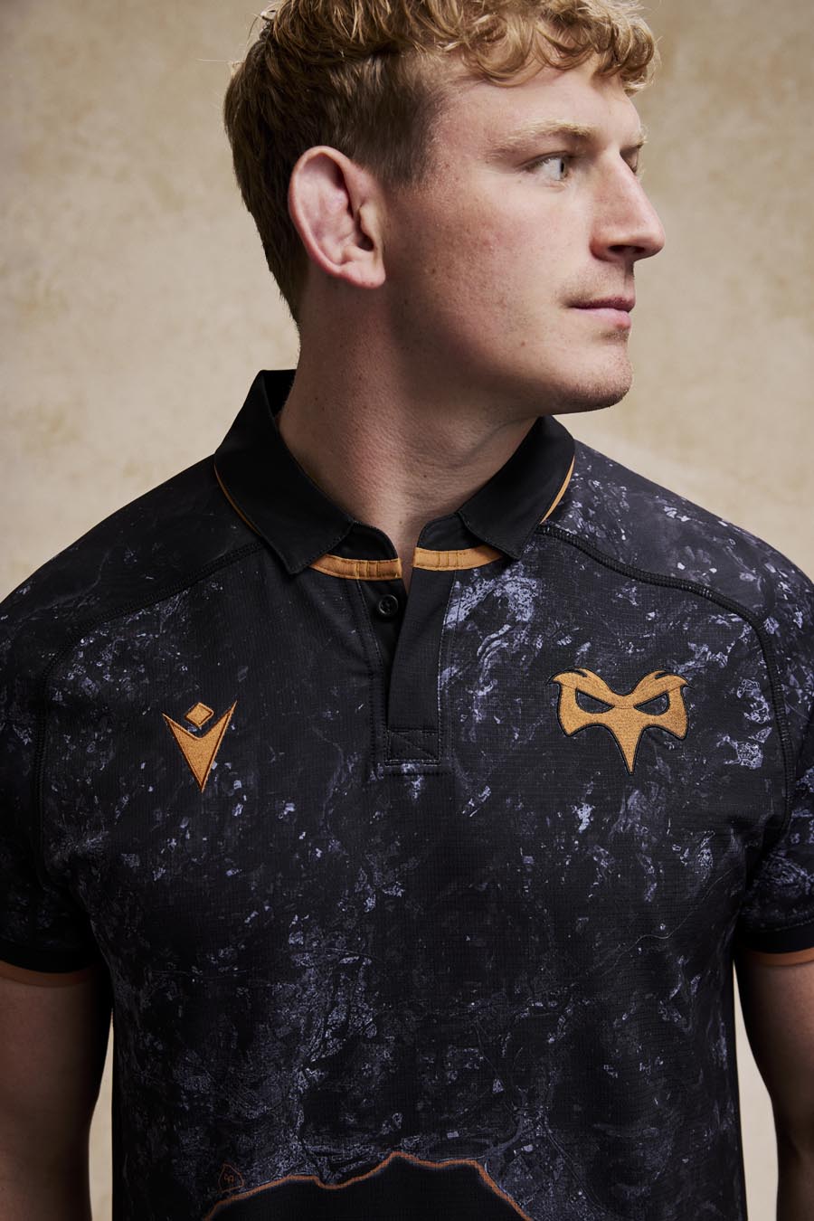 La nuova maglia Home 2025/26 degli Ospreys è prevalentemente nera, con dettagli color rame nel colletto alla coreana e sui bordi manica. La maglia è caratterizzata da una grafica sublimata presente sia sul corpo che sulle maniche, con una rappresentazione tono su tono della mappa della baia di Swansea e del più ampio territorio rappresentato dagli Ospreys. A questa grafica si aggiunge inoltre un design in outline che rende omaggio al futuro stadio degli Ospreys a St. Helen’s. Sul petto a destra è ricamato il Macron Hero, mentre a sinistra lo stemma del club, entrambi color rame. Il collo interno è personalizzato con un’etichetta con sfondo che riprende la grafica della maglia, lo stemma del club e la scritta OSPREYS, il logo Macron e la scritta ‘Designed in Bologna’ che certifica come ogni capo sia ideato, progettato e sviluppato presso il Macron Campus. Nel retrocollo esterno, in marrone chiaro, è stampato il profilo della futura casa del club a St. Helen’s, riproposto anche a fondo maglia in stampa embossata con all’interno lo stemma degli Ospreys. Il kit Home è completato da pantaloncini neri con coulisse rame e bande sui fianchi che riprendono la grafica della maglia. I calzettoni sono neri con riga orizzontale rame poco sotto il bordo superiore.